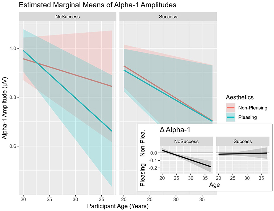 The mixed model to analyze EEG alpha activity in different conditions was defined as Alpha-1 ~ Aesthetics * IllusionOfSuccess * Age + (1|ID). The model provided a good fit relative to model 0, = 21.02, p = 0.004. A negative main effect of illusion of success was observed (see Table 3). In terms of the interaction between the aesthetics manipulation and age, an effect was found revealing that participants in their late twenties and early thirties experienced the pleasing design condition decreased alpha-1 amplitudes in frontal areas (see Figure 8, Δ Alpha-1).