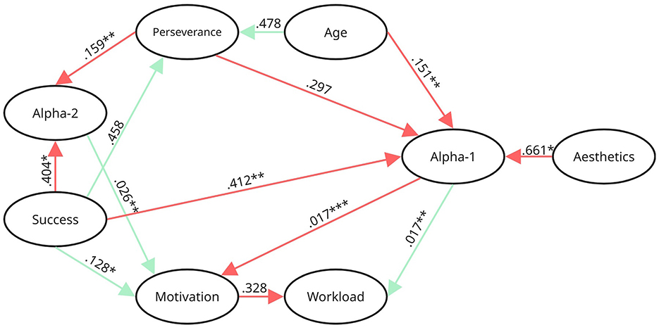 As illustrated in Figure 9, Aesthetics shared a direct arc with alpha-1 activity only (r = −0.66*) and indirectly influenced workload (alpha-1 -> workload, r = 0.02**) and motivation (alpha-1 -> motivation, r = −0.02***). Illusion of success showed a direct association with perseverance times (r = 0.46) as well as an association with alpha-1 amplitudes (r = −0.41**) and alpha-2 amplitudes (r = −0.40*). Additionally, there was a connection between illusion of success and motivation (r = 0.13*) that was established directly but also indirectly via the alpha-1 (alpha-1-> motivation, r = −0.02***) and alpha-2 (alpha-2-> motivation, r = 0.03**) pathway. Additionally, indirect connections were observed with workload through motivation (motivation-> workload, r = −0.33) and alpha-1 (alpha-1 -> workload, r = 0.02**). Moreover, through perseverance, illusion of success further influenced alpha-1 (perseverance-> alpha-1, r = −0.30) and alpha-2 activity (perseverance-> alpha-2, r = −0.16**).