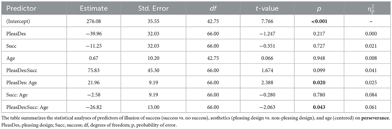 Table 1. Mixed-model analyses regression: effects of predictors “aesthetics,” “illusion of success,” and “age” on “perseverance.”