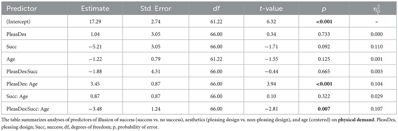 Table 2. Mixed-model analyses: effects of predictors “aesthetics,” “perception of success,” and “age” on physical demand.