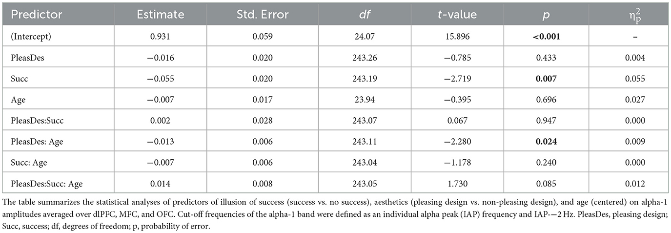Table 3. Mixed-model analyses: effects of predictors “aesthetics,” “illusion of success” and “age” on alpha-1 amplitudes.