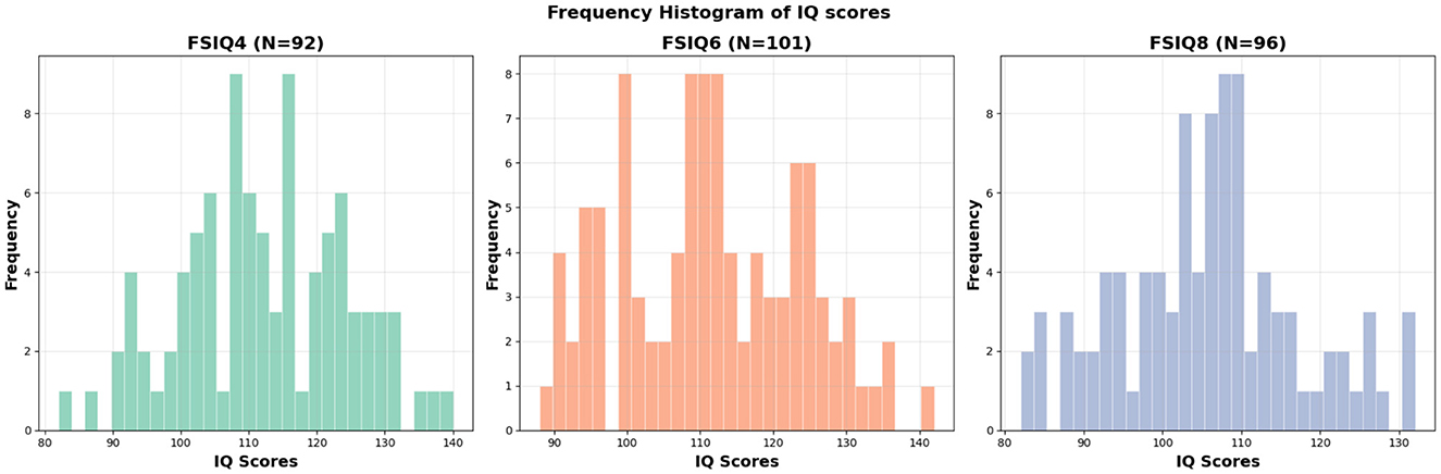 Figure 1. Histogram of FSIQs at different ages. FSIQ4: mean = 112.04, std = 12.34, FSIQ6: mean = 111.43, std = 12.33, FSIQ8: mean = 105.55, std = 11.54.