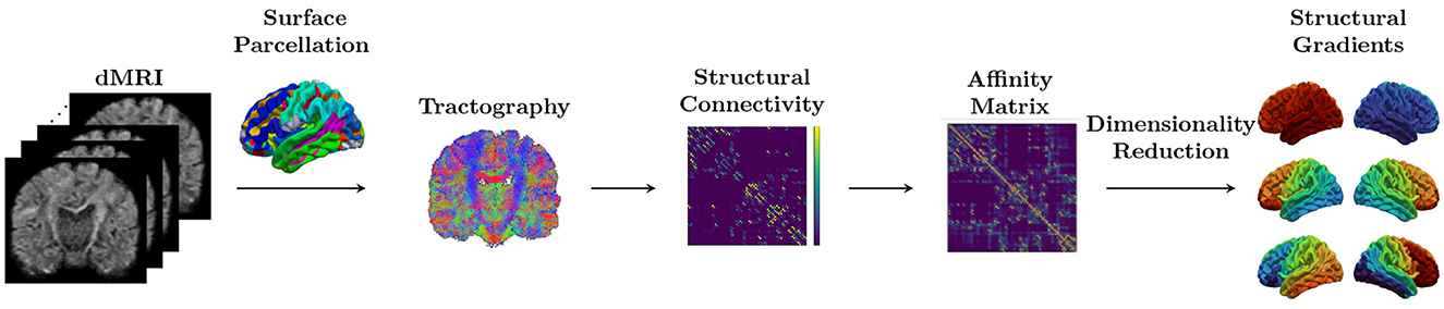 Figure 2. Schematic overview. The structural connectome (SC) matrix is generated from dMRI by counting the number of streamlines connecting each pair regions in surface parcellation. Diffusion map embedding, a non-linear dimensionality reduction technique, is applied to the affinity matrix computed from the SC. A set of gradient vectors was calculated and sorted based on their corresponding eigenvalues.