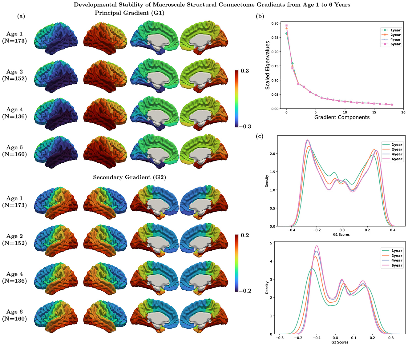 Structural connectome gradients were identified as eigenvectors of the similarity matrix of the SC from non-linear dimensionality reduction technique. The principal gradient exhibited a left-to-right axis, and the secondary gradient exhibited an anterior-to-posterior axis (Figure 3a, Supplementary Figure 1a). The principal gradient explained about 30% of information (Figure 3b, Supplementary Figure 1b). We also computed the structural gradients at 2, 4, and 6 years, and found they appear similar at ages 1, 2, 4, and 6 (Figure 3c).