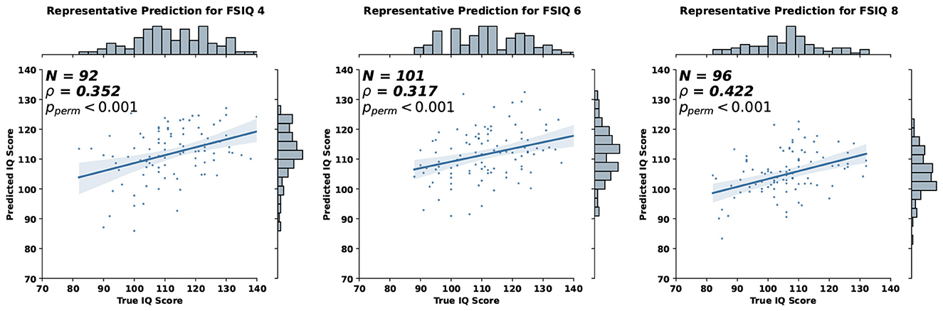 Using the proposed GCN-based approach, we were able to predict each individual's cognitive outcome from their structural gradients at age 1. Representative prediction results from our model are shown in Figure 4, where the statistical significance was assessed using permutation tests (Good, 2000; Manly, 2006), which provide exact p-values without distributional assumptions. The correlation between predicted and observed IQ scores was evaluated by shuffling predicted values 10,000 times to generate a null distribution under the hypothesis of no association.