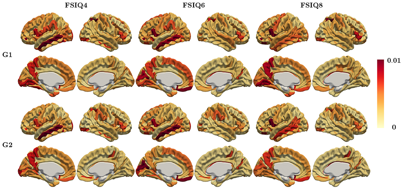 The weight attributions of regional relevance for predicting each target IQ obtained by Saliency Maps (Simonyan, 2013) are shown in Figure 5, where the weights are averaged across different cross-validation folds for each region. It is important to note that individual feature importance maps may not always align perfectly with the average pattern. The regions consistently selected in the top 5% weights for all target IQ scores were found in the left hemisphere's lateral orbital sulcus, opercular part of the inferior frontal gyrus, and subcallosal gyrus, which are included in the FrontoParietal, CinguloOperc, and default mode network. We also applied other feature attribution methods, specifically Integrated Gradients (IG) (Sundararajan et al., 2017) as well as the feature attribution for AAL parcellation. The corresponding feature importance maps are shown in Supplementary Figures 3, 4, respectively.
