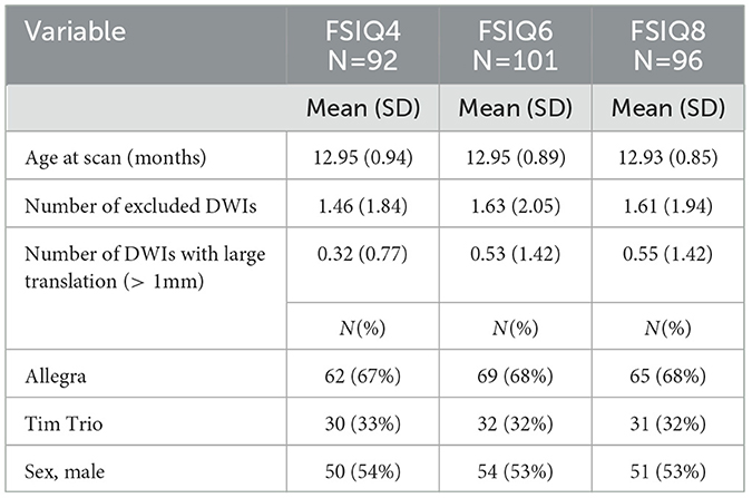 The cognitive performance of each subject was assessed by the 5th Edition of the Stanford–Binet Intelligence scales (Roid, 2003). The Stanford–Binet is a standardized set of assessments used to assess intelligence (IQ) across the lifespan. This study focuses primarily on the full-scale IQ (FSIQ) score, with exploratory analyses examining effects on abbreviated IQ (ABIQ), verbal IQ (VIQ), and nonverbal IQ (NVIQ). The composite scores generated from the Stanford–Binet have strong inter-rater reliability (ranging from 0.74 to 0.97 with a median of 0.90) and test–test reliability (correlations in the 0.80s and 0.90s). All of the scores utilized in this study are normalized standard scores, with means of 100 and standard deviations of 15. The distribution of FSIQ scores across ages 4, 6, and 8 years is presented in Figure 1. Detailed demographic and scan information for participants in the FSIQ prediction analysis can be found in Table 1.