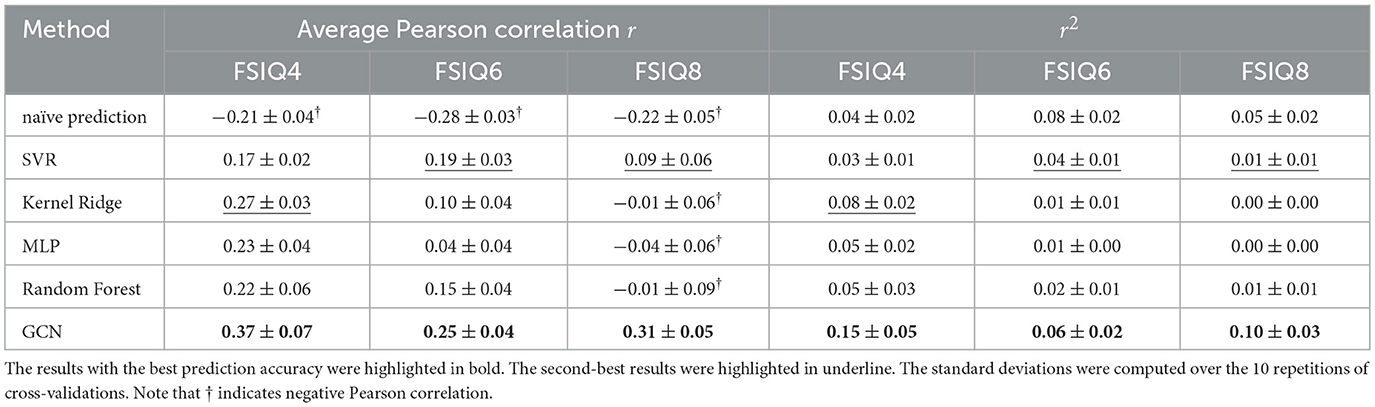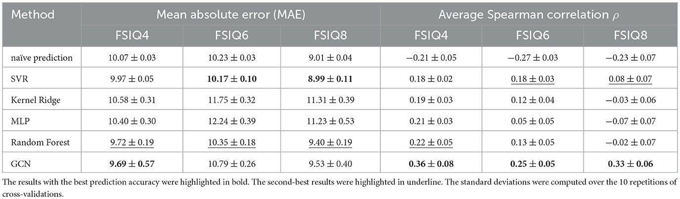 We compared the prediction accuracy of our model with other existing machine learning methods in Tables 2, 3. We utilized the scikit-learn package in Python to implement other machine learning methods, using the default hyperparameters except for the following changes: for Random Forest, max_depth was set to 100 and n_estimators to 50; for MLP, hidden_layer_sizes was set to (64, 64, 64, 64). Compared to other methods, our model provided consistent and robust prediction results (mean Spearman's correlation > 0.25). We note that the results summarized in Tables 2, 3 are the average MAE, Spearman correlation, and Pearson correlation across 10 repetitions of 10-fold cross-validation. For each repetition, the results are aggregated across the 10 folds. In addition, we compared our model against a naïve baseline predictor that assigns the mean IQ of the training set to all test samples within each cross-validation fold. Our model exhibited competitive MAE values while showing substantial improvement in predictive correlation. These results demonstrate that the model captures meaningful individual differences in cognitive ability, with performance comparable to prior neuroimaging studies (R = 0.35–0.50 for general intelligence Vieira et al., 2022).