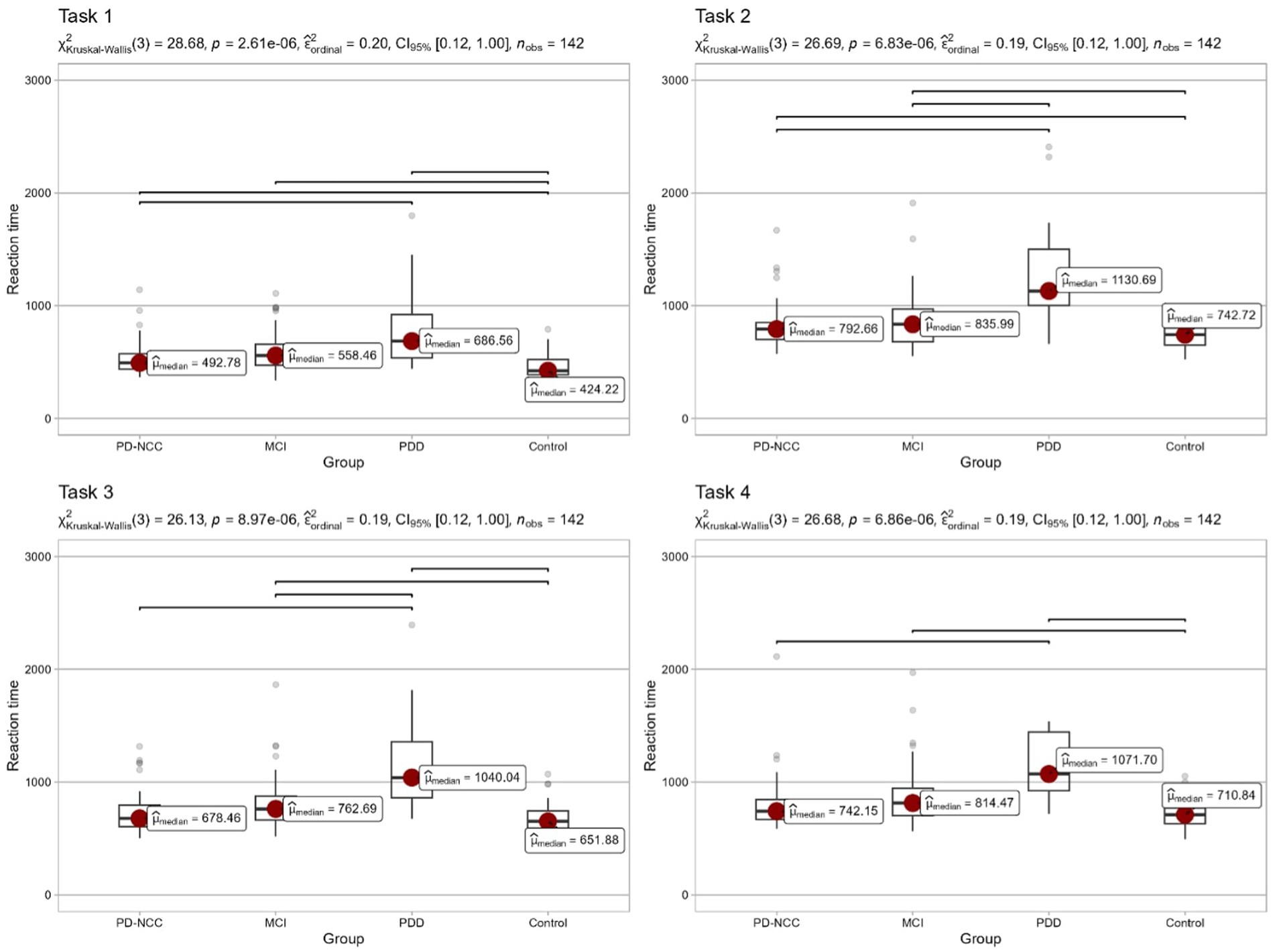 Four box plots illustrate reaction time data across different groups (PD-NCC, MCI, PDD, Control) for Tasks 1 to 4. Each plot displays median values and statistical details, including Kruskal-Wallis test results. Reaction times are presented on the y-axis, with group labels on the x-axis. Outliers are shown as dots, and comparisons between groups are indicated with lines above the boxes.