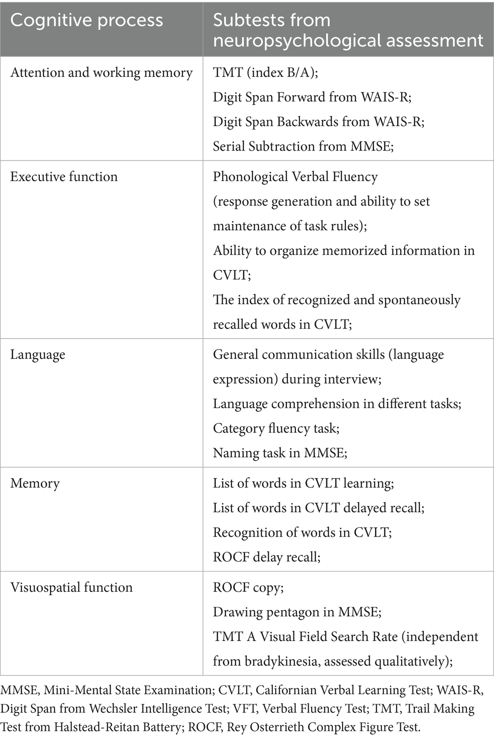 Sociodemographic information was collected at the outset of the survey. Then, the tests were presented to each participant in the same order: Mini-Mental State Examination (MMSE) (Folstein et al., 1983), Californian Verbal Learning Test (CVLT) (Baños and Martin, 2002), Digit Span from Wechsler Intelligence Test WAIS-R (Brzeziński et al., 2004), Verbal Fluency Test; Trail Making Test from Halstead-Reitan Battery (TMT A and B) (Bowie and Harvey, 2006), Rey Osterrieth Complex Figure Test (ROCF) (Shin et al., 2006). The subtests from these assessments were utilized to evaluate cognitive functioning based on the Movement Disorder Society’s criteria for Level II cognitive assessment, encompassing five cognitive domains: attention and working memory, executive function, language, memory, and visuospatial abilities (see Table 1) (Litvan et al., 2012). Cognitive dysfunction was required to manifest as a consistent pattern in at least two subtests to be considered significant. We also used the Geriatric Depression Scale to assess the presence of depression (ranged 0–30) or depression symptoms severity (Montorio and Izal, 1996).