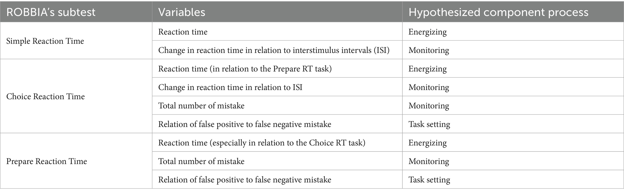 Four tasks comprise indicators of three processes forming anterior attentional system processes (Stuss et al., 2005; Harciarek et al., 2016). The hypothetical processes and their measurement indicator are presented in the Supplementary Table 2 (Table 2).