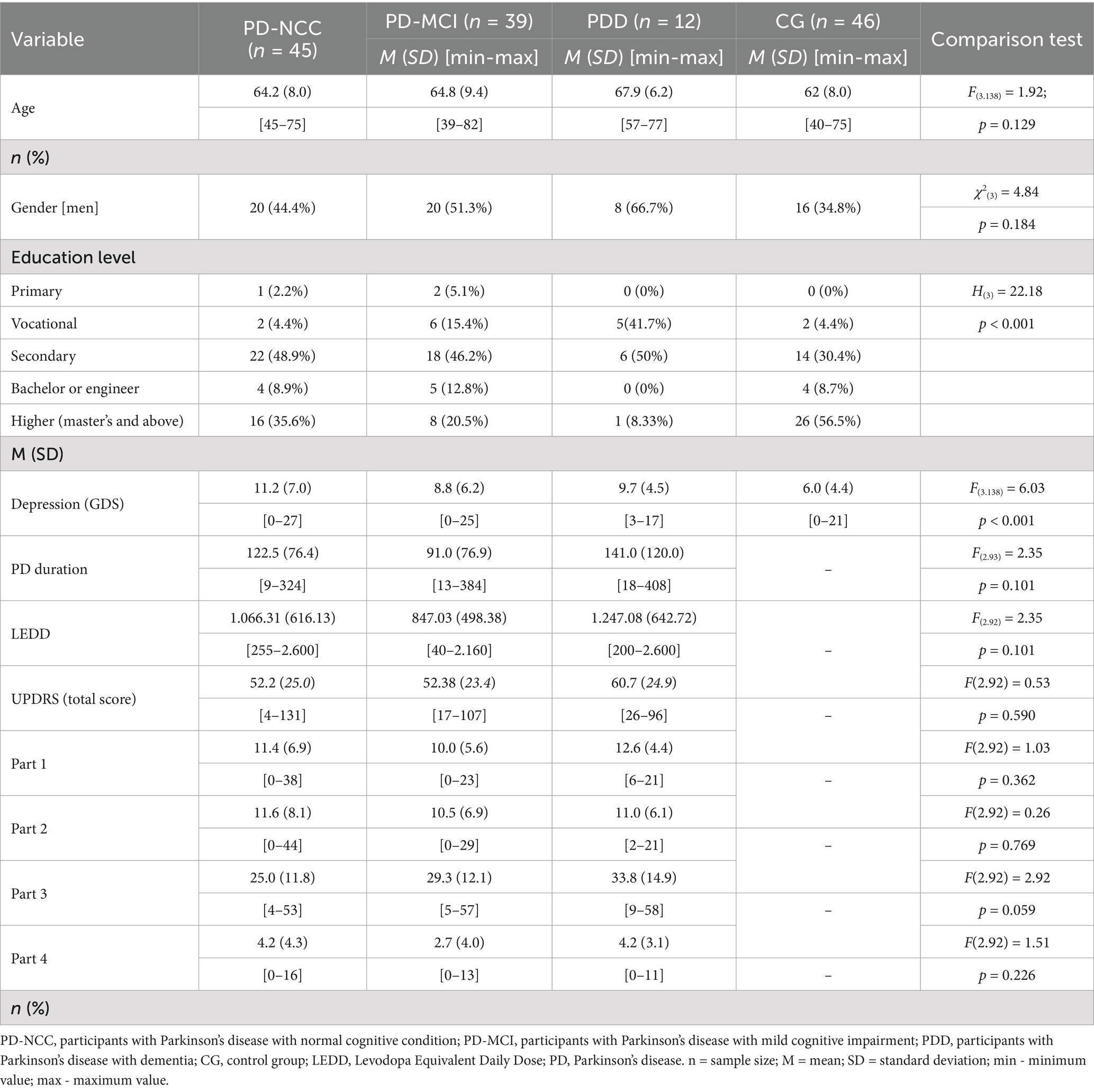 From 2020 to 2023, 96 participants with Parkinson’s disease (45 with PD-NCC, 39 with PD-MCI, and 12 with PDD) and 46 participants from the control group were recruited, and data were analyzed. The demographic and clinical characteristics of the participants from the clinical samples and the comparison group were well-balanced, as shown in Table 3. The results of the pilot study, which were published separately, were included in the main analyses (Golińska et al., 2021).