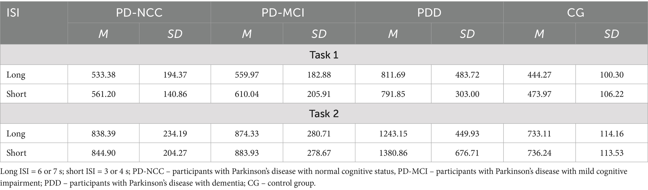 Table 4. Reaction times across different groups and varying ISI: tasks 1 and 2.