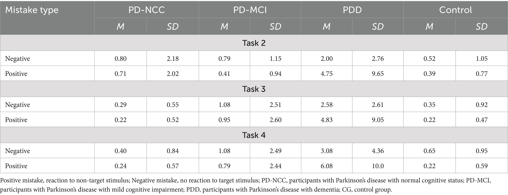 Energization was calculated as the mean of all reaction times participant obtained in one of the trials. Secondly, the mean reaction times for all participants assigned to PD-NCC, PD-MCI, and PDD were calculated. Energization was measured in simple, choice, and prepare reaction time tasks (tasks 1, 2, 3, and 4). The monitoring consisted of two indicators: change in reaction time in relation to ISI and total number of errors. Changes in reaction time in relation to ISI were divided into two categories: short ISI (time intervals of 3 s and 4 s) and long ISI (time intervals of 6 s and 7 s). In the next step, the means of trials with short ISI and long ISI were calculated (first for each participant, then for the four groups). The total number of errors was defined as the number of mistakes made by pressing the wrong button (button 1 or button 2). Task setting was measured as the false positive/false negative error ratio. A false positive error occurred when reacting to the target as if it were a non-target. A false negative error was defined as responding to the non-target as if it were a target.