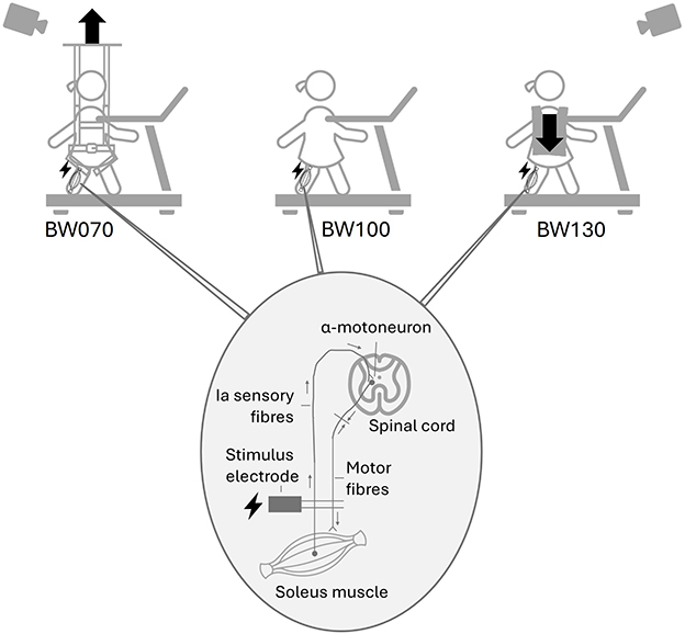 Figure 1. Study setup: Children walked barefoot on a treadmill under three different weight-bearing conditions: normal bodyweight (BW100), 30% bodyweight unloading (BW070), achieved using a bodyweight support system, and 30% additional bodyweight (BW130), applied using a weight vest. Below, the H-reflex mechanism is illustrated, showing the stimulus electrode triggering the nerve in the back of the knee, the Ia sensory fibers connecting with the α-motoneuron in the spinal cord, projecting to the soleus muscle fibers, adapted from Gwerder et al. (2025b).