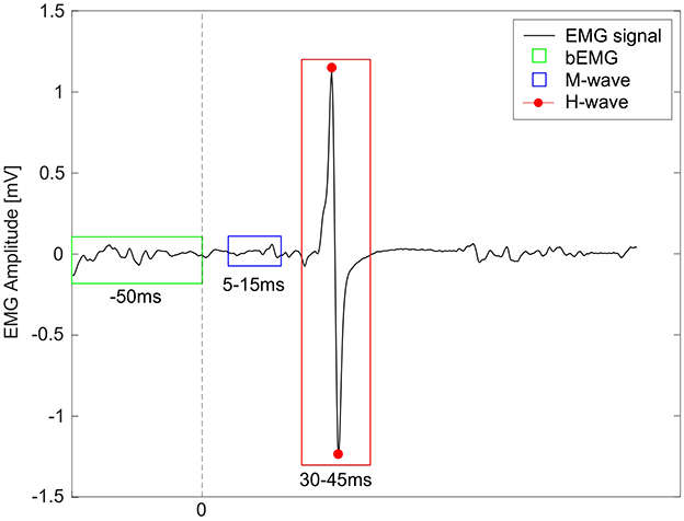 Figure 2. Example of a soleus EMG signal (black) from a child with idiopathic toe walking. The dashed line at 0 represents the timing of the electrical stimulus. The green box represents the window for the baseline EMG (bEMG), the blue box for the M-wave, and the red box shows the peak-to-peak amplitude of the H-reflex (highlighted with red points).