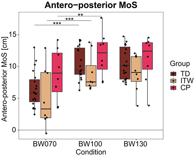 Figure 3. Antero-posterior margin of stability (MoS) for the three different weight-bearing conditions normal bodyweight (BW100), 30% bodyweight unloading (BW070), and 30% additional bodyweight (BW130) for typically developing (TD, dark red), idiopathic toe walking (ITW, orange), and cerebral palsy (CP, pink) children. ** (p < 0.01), *** (p < 0.001) show significant differences from baseline (BW100).
