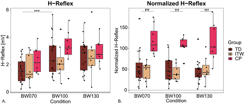 Figure 4. Hofmann reflex (H-reflex) peak-to-peak amplitudes for non-normalized (A) and normalized data (B) for the three different weight bearing conditions normal bodyweight (BW100), 30% bodyweight unloading (BW070), and 30% additional bodyweight (BW130) for typically developing (TD, dark red), idiopathic toe walking (ITW, orange), and cerebral palsy (CP, pink) children. *** show significant differences from baseline (BW100, p < 0.001), while ††† denote significant group differences between pathological and typically developing (TD) groups (p < 0.001).