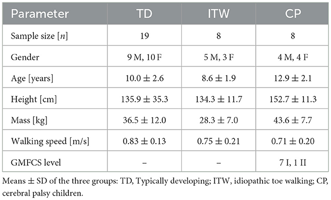 Nineteen TD children, eight with ITW, and eight with mild CP (spastic hemiparesis, GMFCS levels I and II, aged 6–18 years, participated in this study (Table 1). Exclusion criteria were (a) any acute or chronic neurological or musculoskeletal conditions other than ITW or CP, (b) injuries or surgeries affecting the lower extremities within the past year, (c) Botox treatment within the previous 6 months, (d) acute pain, (e) vertigo or balance problems, (f) unable to walk on a treadmill for 4 min, or (g) use of medication that could affect balance.