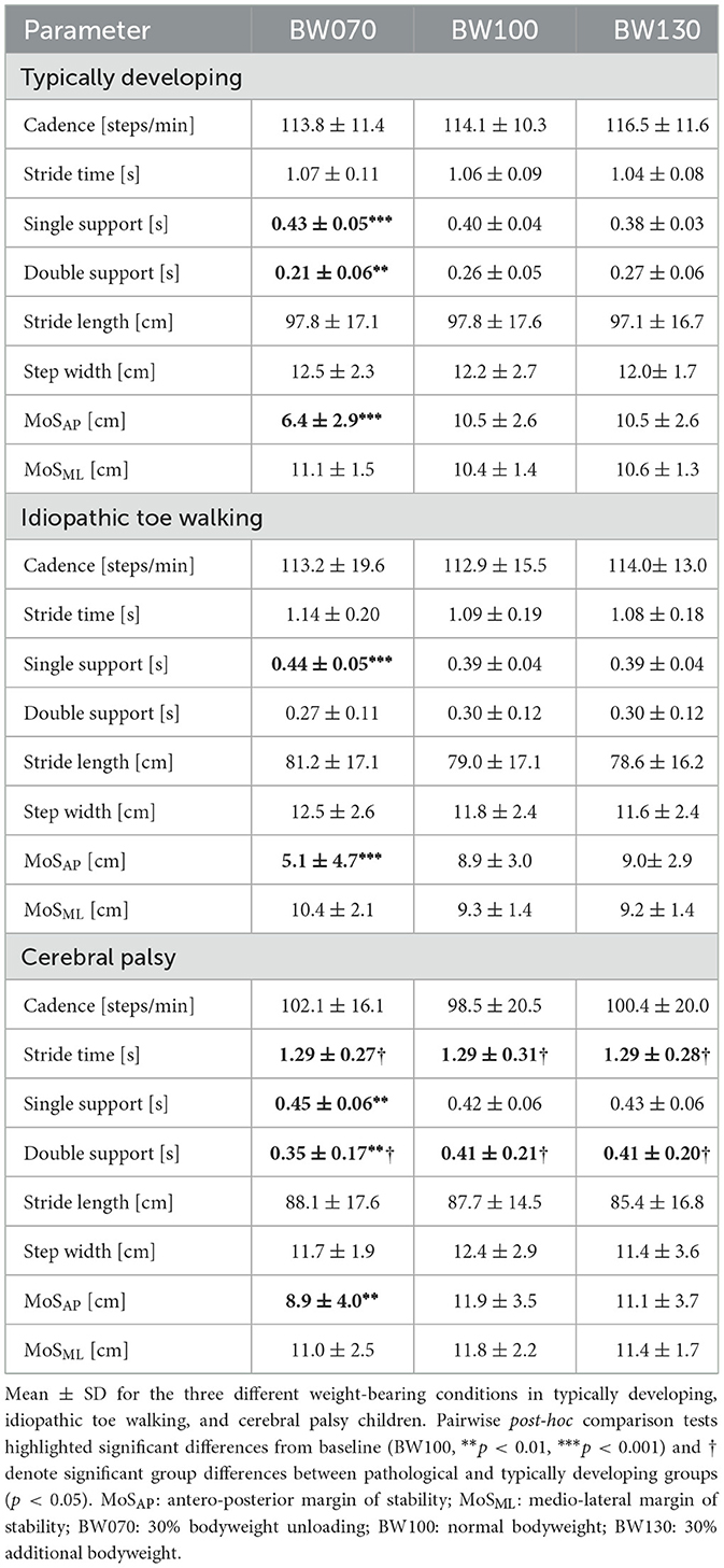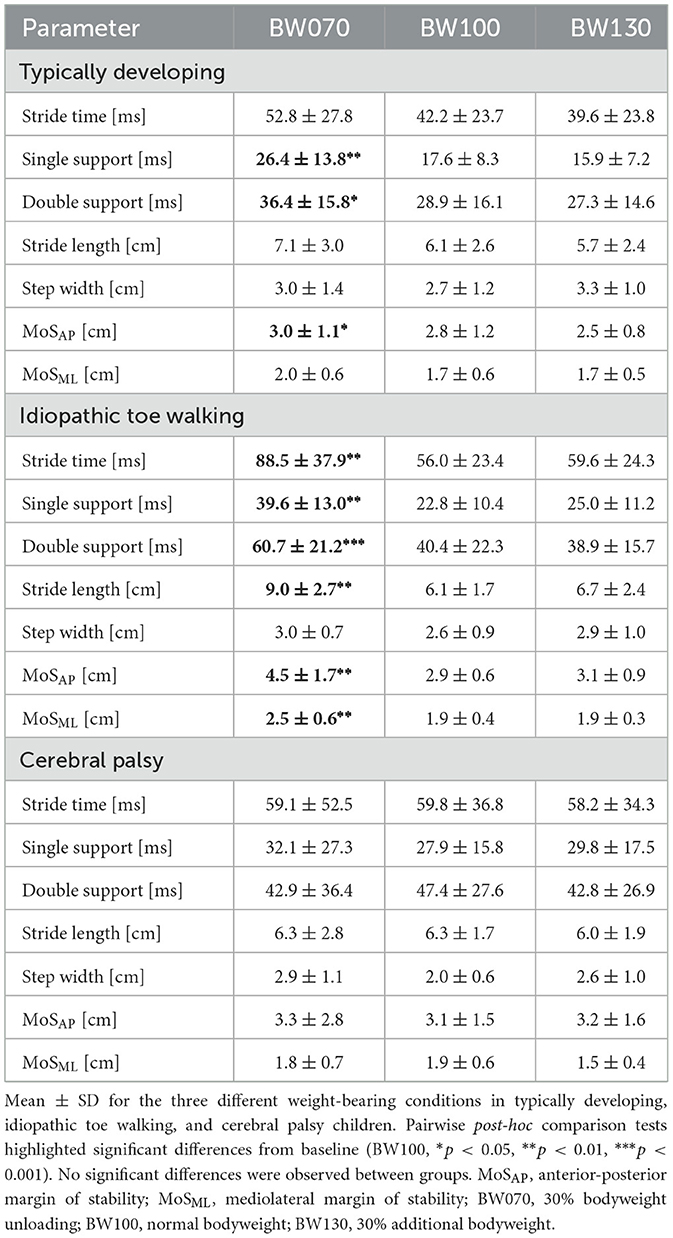 The study setup was complex, and several limitations should be acknowledged. The biggest limitation was the limited participation pool for ITW and CP children, potentially due to the restrictive eligibility criteria in order to include homogenous groups and to obtain relevant data. This study provides first evidence on how ITW and CP children adapt to different weight-bearing conditions and their underlying peripheral control mechanisms. However, larger studies are needed to confirm these findings. Additionally, due to the absence of ground reaction force data, the boundaries of the BoS were approximated using foot marker positions, which may have led to an overestimation of the MoS and did not account for medio-lateral ankle strategies. Furthermore, measurements were conducted on a treadmill at fixed speeds, which may not fully replicate the biomechanics of natural overground walking (Hollman et al., 2016). Walking speed usually changes under different weight-bearing conditions (Apte et al., 2018). However, instead of adjusting step width or walking speed, our participants may have used other strategies, such as foot placement or CoM regulation to adjust their gait patterns. Moreover, while the bodyweight support system effectively reduced loading, it also imposed movement constraints, particularly in the medio-lateral direction. This limitation may have restricted natural hip abduction and step width adjustments. Finally, the relatively short exposure time of 4 min per condition was intentionally chosen to minimize participant burden and avoid fatigue, particularly in children. While this duration allowed us to observe immediate responses to altered bodyweight, it may not have been sufficient to induce measurable gait or reflex adaptations beyond the initial learning phase. However, given our sample size and measurement setup, it is difficult to draw firm conclusions about such time-dependent adaptations. Future studies interested in long-term adaptations may therefore consider extending the duration or frequency of walking trials to better capture the evolution of motor adjustments under altered weight-bearing conditions. While this complex experimental setup may not have allowed complete movement freedom, it did allow for the capture of extended walking protocols.