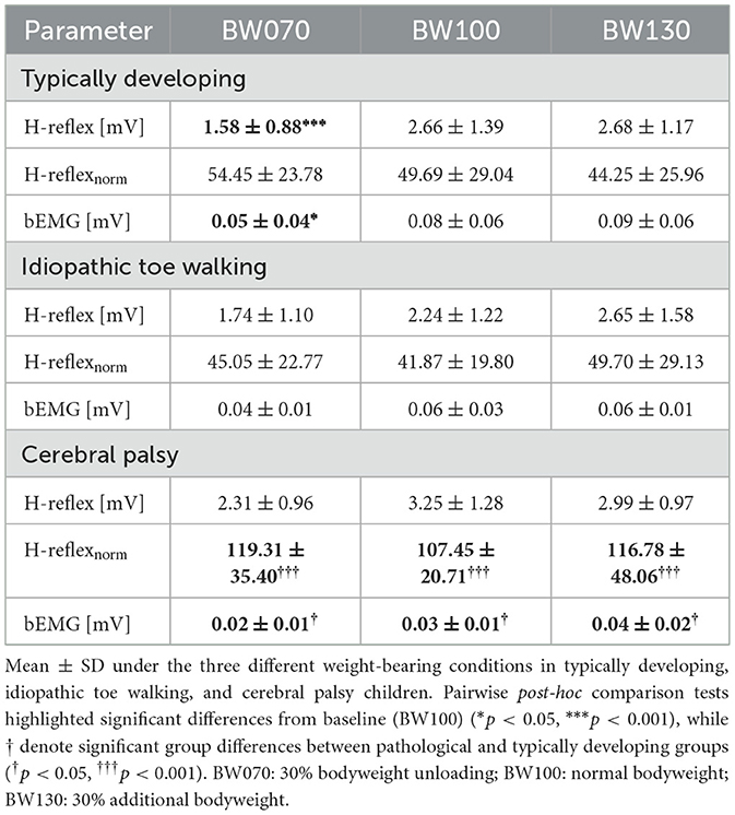 Post-hoc comparisons in H-reflex revealed significant decreases for BW070 compared to BW100 in TD children (41%, p < 0.001) with similar trends in ITW (22%), and CP (29%, Table 4 and Supplementary material, 2. Statistical Analysis Table S3, Figure 4A). Furthermore, CP children exhibited significant reduced bEMG values compared to TD children (p < 0.05). Finally, there was a significant group difference with CP children showing 116% higher H-reflexnorm at BW100 compared to TD children (p < 0.001, Figure 4B).