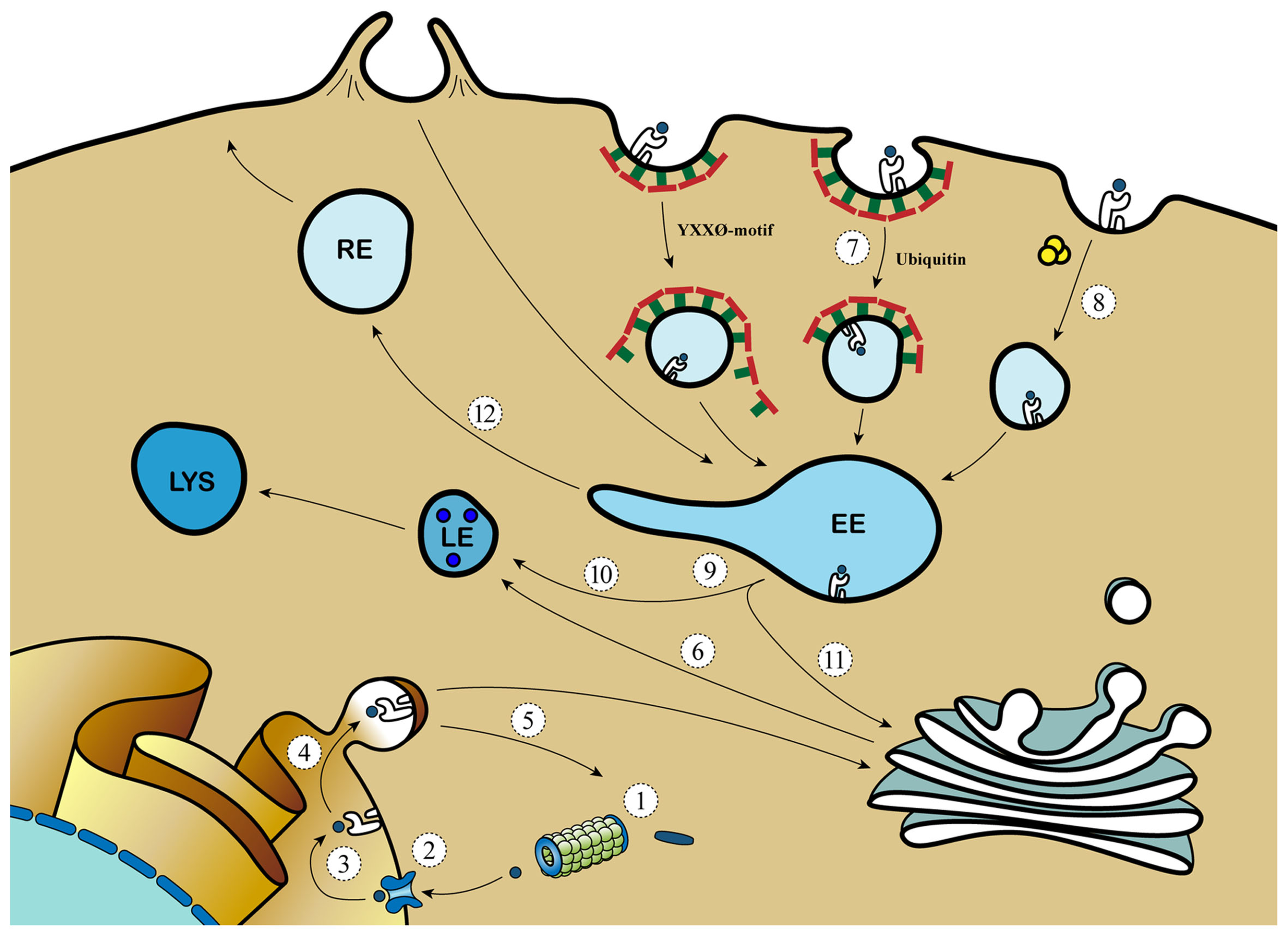 Viral evasion strategies aim at different pathways of MHC transport. 1: Inhibition of proteasomal processing (EBV); 2: Inhibition of TAP (EBV, HSV, CMV); 3: Inhibition of peptide transport (EBV, CMV, adeno); 4: Retaining MHC molecules in the ER (adeno, cowpox); 5: Target MHC for proteasomal degradation (CMV); 6: Target MHC from TGN to endo/lysosomal compartments (HIV); 7: Clathrin-dependent MHC internalization (EBV, KSHV, HIV, CMV); 8: Clathrin independent MHC internalization (HIV); 9: Arresting phagosomal maturation (mycobacteria, Salmonella, Chlamydia, and Leishmania); 10: Targeting MHC to the LE/lysosome (HSV); 11: Inhibition of retromer activity (HVS); 12: Inhibition of progression to the RE (CMV, HSV).