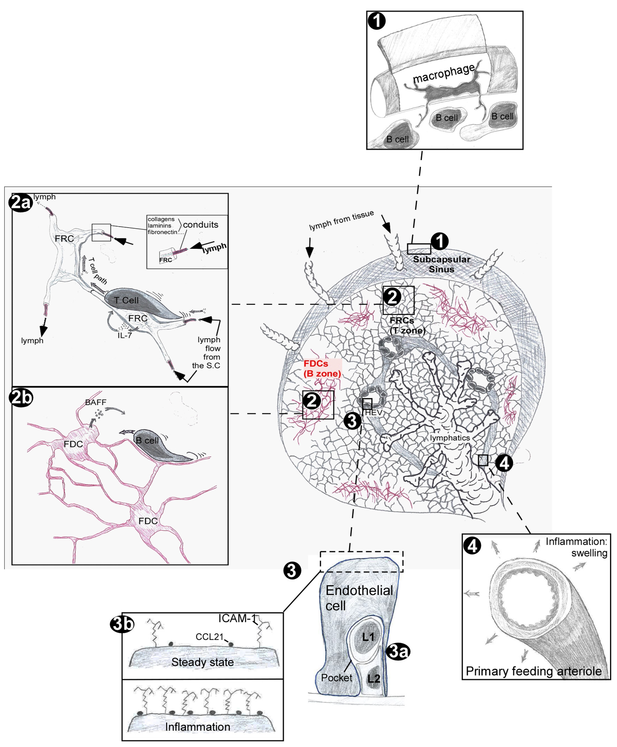 Millions of lymphocytes enter and exit LNs each day, accessing the parenchyma via HEVs and egressing via efferent lymphatics. Despite this high rate of cellular flux, the number of lymphocytes present in a resting LN is extraordinary stable over time. The control of lymphocyte trafficking is mediated by the endothelial cells of HEVs that harbor typical cobblestone shapes with numerous embedded lymphocytes (Girard and Springer, 1995). Recent evidences revealed that these T and B cells are frequently packed together underneath the endothelial cell inside “pockets” composed of 4–5 lymphocytes (Figure 1, item 3a). These pockets function as waiting areas that hold and grant lymphocytes access to LN parenchyma in proportion to the rate of lymphocyte egress from the LN, enabling the LN to maintain a constant cellularity while supporting the extensive cellular trafficking necessary for repertoire scanning (Mionnet et al., 2011).
