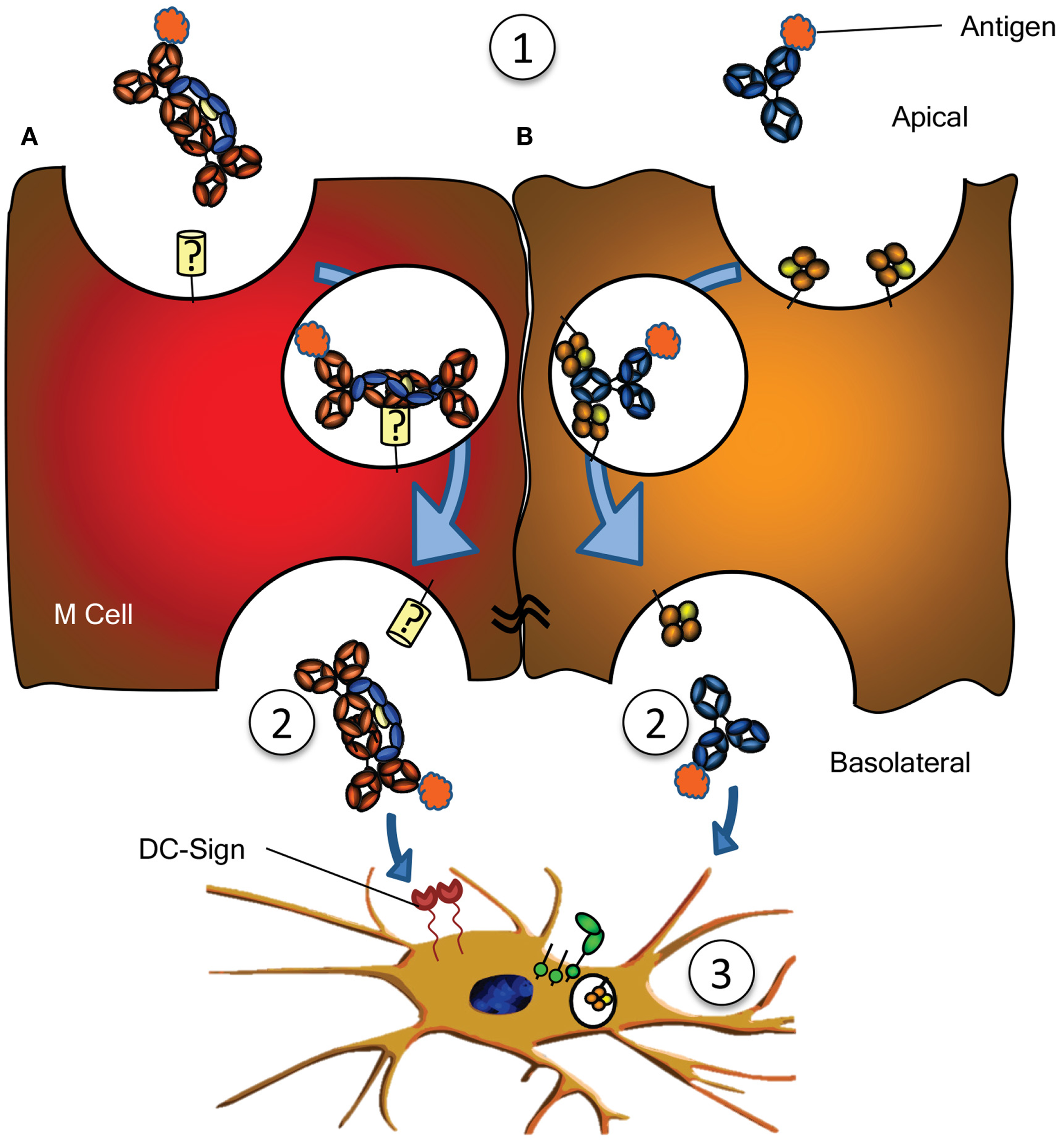 Antigen sampling and amplification of humoral immune responses. (A) SIgA recognizing its cognate antigen (1) is taken up by M cell, possibly though a yet unidentified receptor on M cells. This complex has been demonstrated to traverse the epithelial layer (2) and to be taken up by DCs (3) possibly through DC-SIGN recognition. (B) Similarly, antigen bound by IgG (1) can traverse the epithelial layer through FcRn-depended transcytosis and taken up by DCs through FcγR and FcRn (2) (73). Both IgG- or IgA-mediated antigen uptake can enhance antigen presentation, subsequent activation and proliferation of antigen-specific B- and T cells, boosting immune responses (3). See text for more details.