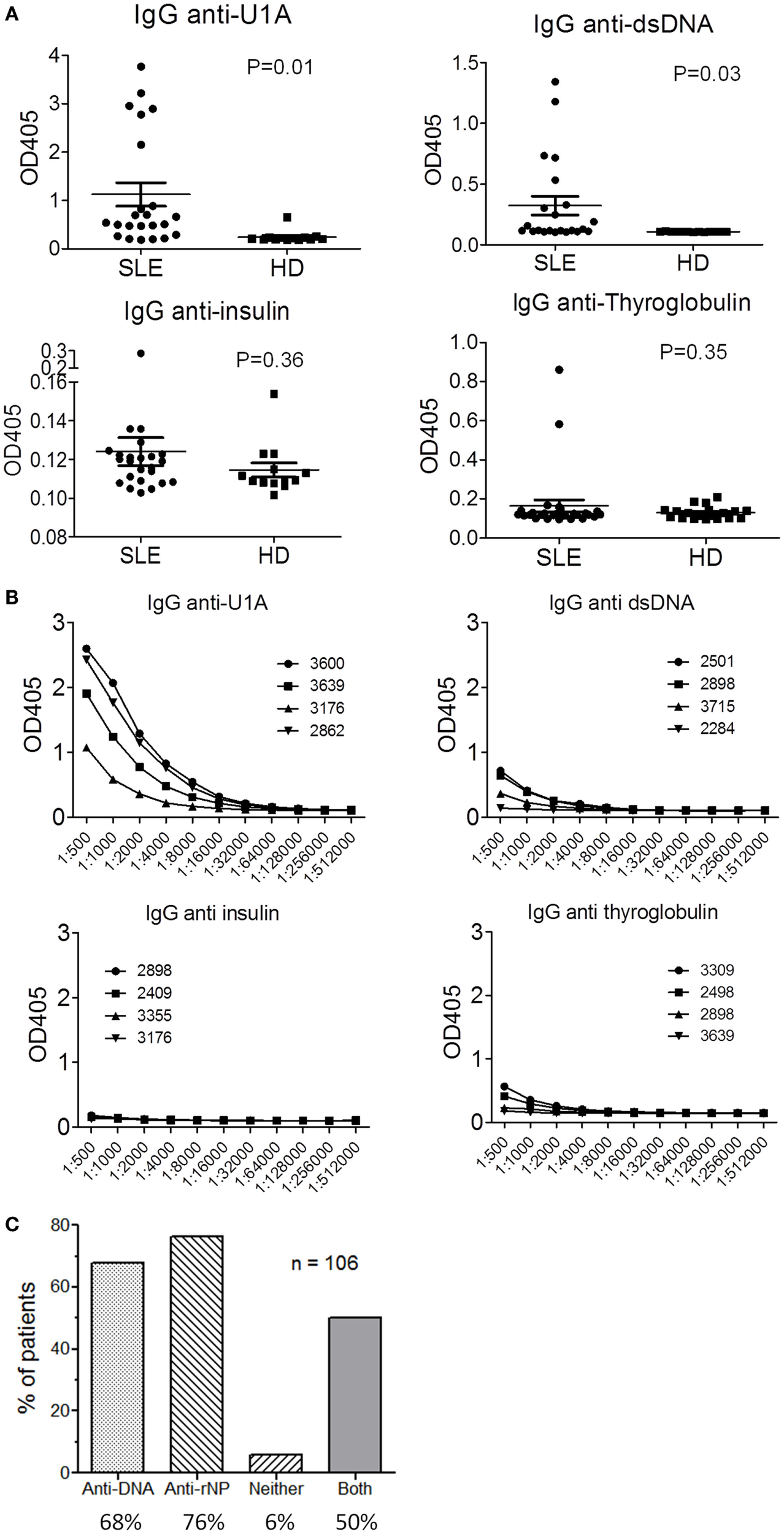 Serum autoantibodies in SLE. Levels of serum IgG anti-U1A, dsDNA, insulin, and thyroglobulin autoantibodies were tested by ELISA in 23 consecutive SLE patients and 13 controls. SLE was classified using the ACR criteria. Healthy controls age and gender-matched had no history of systemic autoimmune disease. These studies were reviewed and approved by the University of Florida Institutional Review Board. (A) Antigens were coated on plastic wells at 0.8 μg/ml and sera were diluted 1:500 for screening. (B) ELISA titration curves (serial twofold dilutions) for the four sera most strongly reactive with each antigen. Patient ID number is shown in the key. (C) Frequencies of anti-dsDNA, anti-RNA-protein (rNP, anti-Sm, RNP, Ro/SS-A, and La/SS-B) autoantibodies detected by commercial ELISAs in a cohort of 106 SLE patients. Only 6% of the sera were unreactive with both dsDNA and the ribonucleoprotein autoantigens.