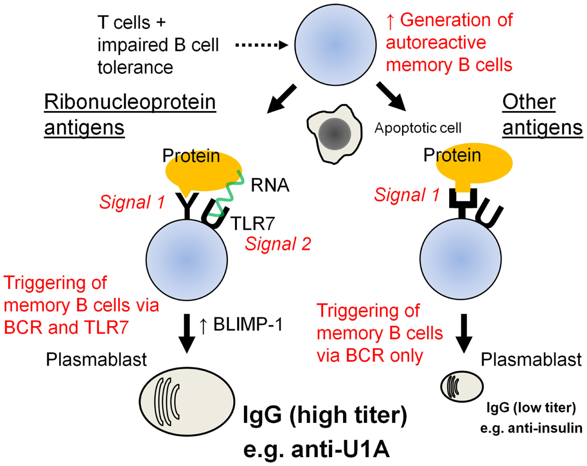 Proposed model of autoantibody generation in SLE. SLE is associated with genetic abnormalities that impair central or peripheral B-cell tolerance. In the presence of T-cell help, autoreactive B cells that escape censoring may develop into IgG-producing memory B cells. However, these cells can circulate without producing autoantibodies. Following subsequent antigen exposure, the memory cells enhance their expression of BLIMP-1 and develop into autoantibody-secreting plasma cells. In the case standard autoantigens, such as insulin, which engage only the B-cell receptor, the stimulus to undergo terminal (plasma cell) differentiation is weaker than in the case of RNA-associated autoantigens, such as U1A, which can activate terminal B-cell differentiation via both the B-cell receptor and TLR7. This may explain why levels of anti-U1A (RNP) autoantibodies are markedly higher than anti-insulin autoantibody levels.