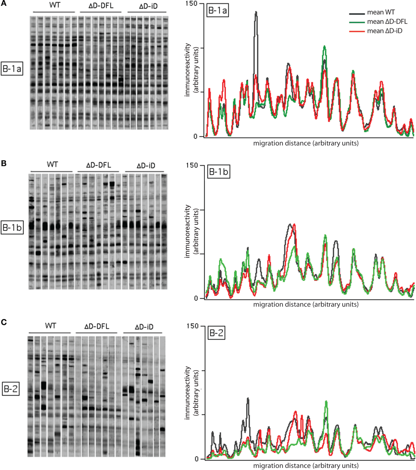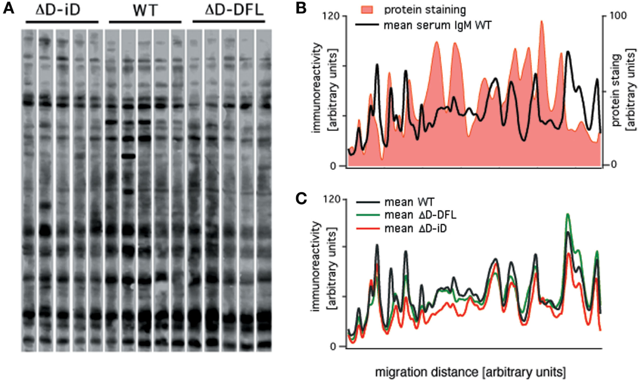 Serum natural IgM pattern of self-reactivity expressed by ΔD-DFL, ΔD-iD, and WT BALB/c mice. (A) Serum IgM reactivities against syngeneic brain extract from five animals of each strain. (B) Total protein staining by colloidal gold densitometric profile was compared to natural IgM recognition profile in the same membrane. (C) Mean serum IgM reactivity profiles of each mouse strain. Raw data adapted from Ref. (25).