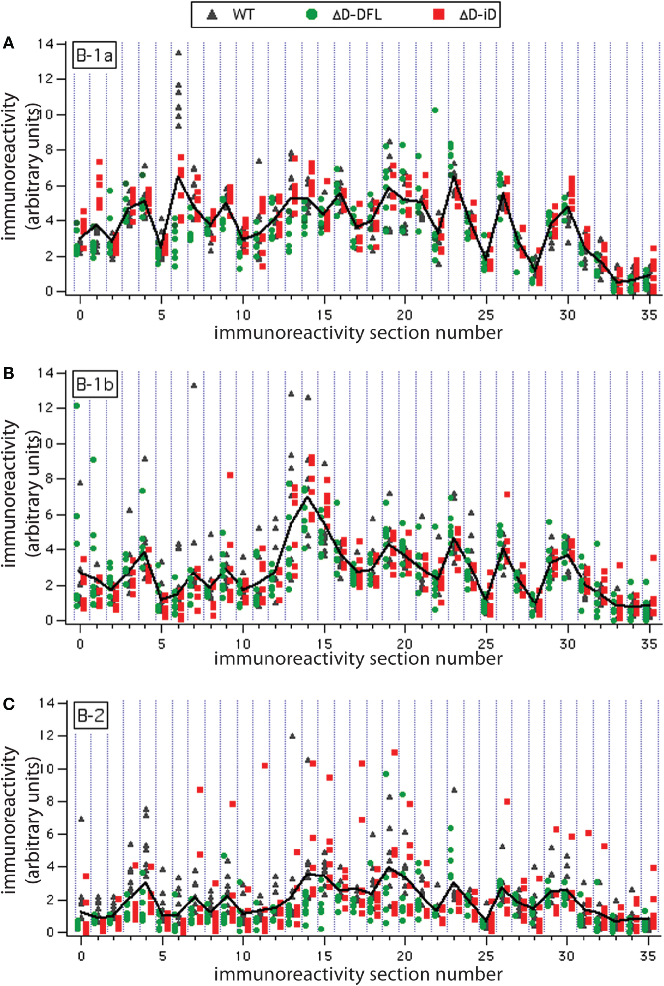 To address the issue of variance in depth, we divided the immunoreactivity profiles into 36 sections, which corresponded to the major bands of reactivity. We plotted the magnitudes of reactivity against these sections for each supernatant from the B-1a, B-1b, and B-2 subsets (Figures 4A–C, respectively). The solid lines indicate the mean profile of all supernatants for each B cell subset. In this format, the variance of the distribution around the mean profile can be properly visualized. Despite few exceptions, we observed that the variance around the mean was much lower for the B-1a supernatants when compared to B-1b and B-2 (Figure 4).