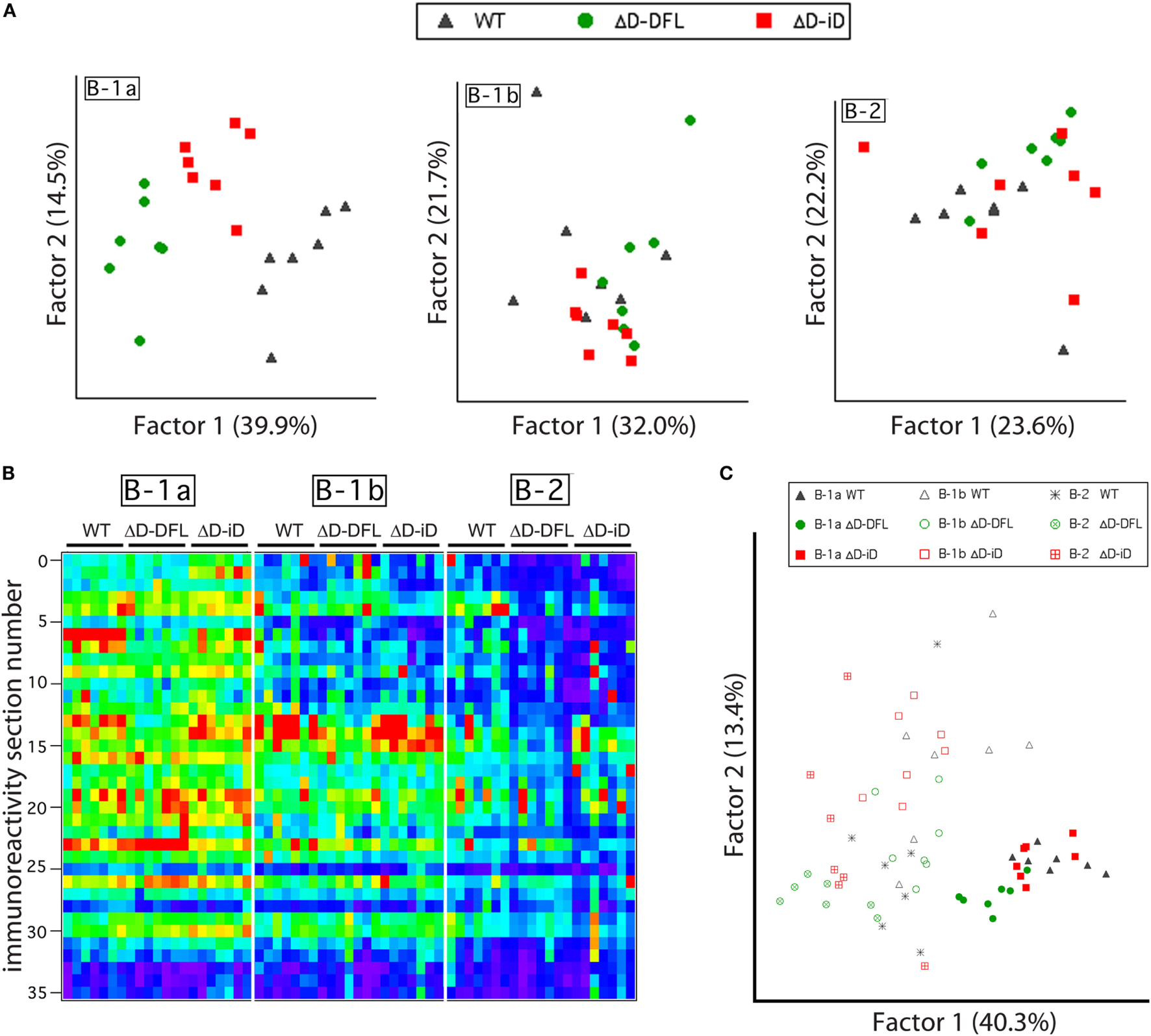 Although the mean reactivity profiles were generally conserved among the three mouse strains (Figure 3A), individual differences between the repertoires were also apparent (Figures 2 and 3). We, thus, performed a PCA of the data presented in Figure 4, which are grouped by B cell subset. This multivariate analysis revealed the impact of the genetic alteration of DH sequences on the B-1a available repertoire of specificities (Figure 6A, left), demonstrating distinct differences between the strains. To better evaluate the contribution of each factor to the resulting B cell subset repertoires, we collected all the data from the reactivity profiles (B-1a, B-1b, and B-2 subsets from the three mouse strains) on a single heat map (Figure 6B). This large data matrix was similarly subjected to PCA.