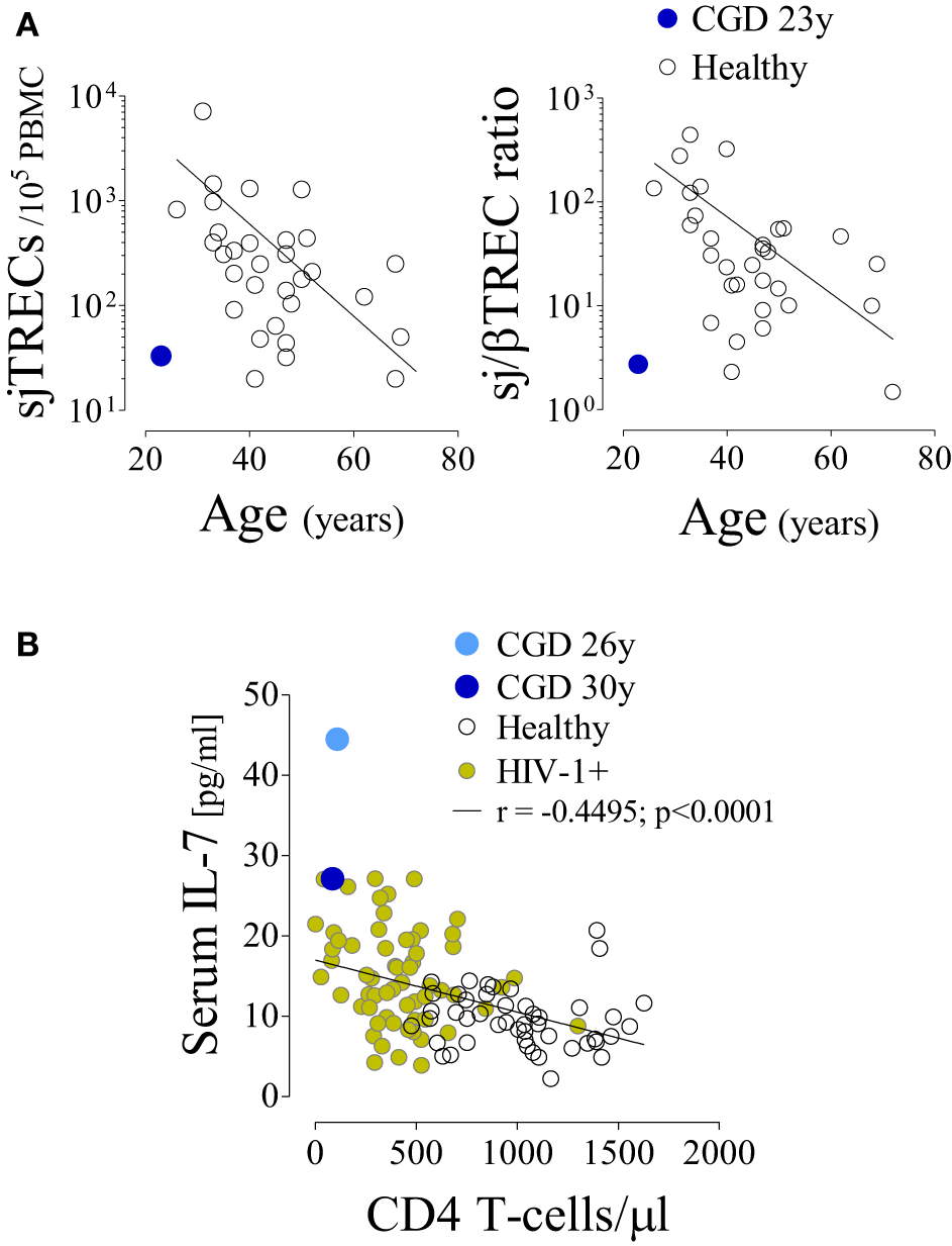 Impaired T-cell production despite increased circulating interleukin (IL)-7 levels in a chronic granulomatous disease (CGD) patient. (A) Signal joint T-cell receptor rearrangement excision circle (sjTREC) frequency and sj/βTREC ratio in total T-cells in relation to age in the CGD patient and healthy subjects. (B) IL-7 levels and CD4 counts in the CGD patient (blue), healthy subjects (black, n = 47), and untreated HIV-1-infected individuals (green, n = 61); each dot represents one individual/time point. P-value and Spearman’s correlation coefficient are shown.