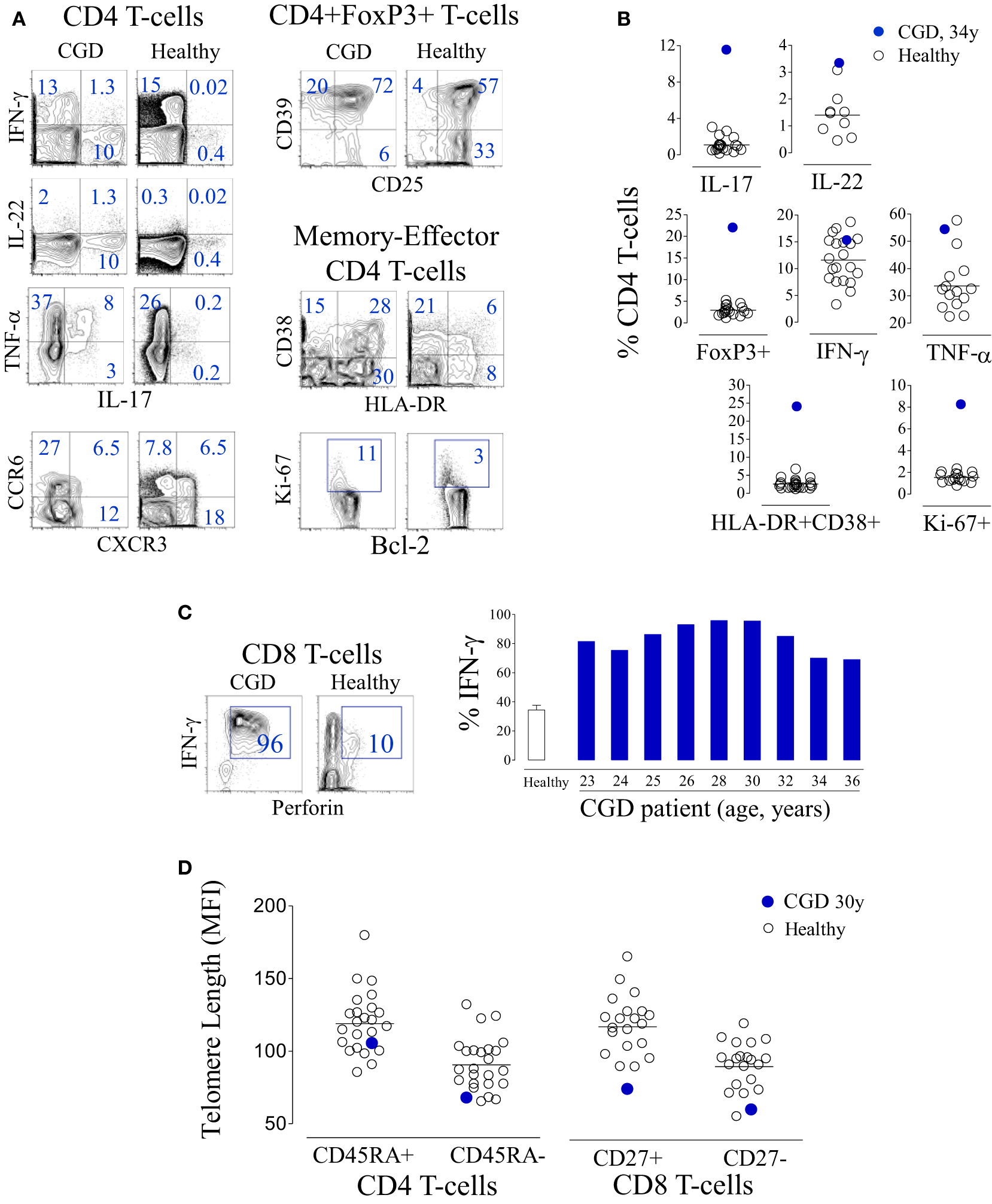 T-cell activation and terminal differentiation in a chronic granulomatous disease (CGD) patient. (A) Representative dot plots of the analysis of cytokine production and chemokine expression within CD4 T-cells, regulatory T-cell-associated markers within CD4+FoxP3+ cells, as well as activation and cycling markers within memory-effector CD4 T-cells from the CGD patient at 36 years of age and a representative age-matched healthy control. (B) Frequency of interleukin (IL)-17-, IL-22-, IFN-γ-, or TNF-α-producing cells, as well as the frequency of FoxP3+, HLA-DR+CD38+, or Ki-67+ cells within the CD4 subset, in the peripheral blood of the CGD patient and healthy subjects. (C) Representative dot plots showing the co-expression of IFN-γ and perforin within CD8 T-cells in the CGD patient and an age-matched control, and a graph showing the frequency of IFN-γ-producing cells within CD8 T-cells of the CGD patient at different ages and of healthy adults (bar represents mean ± SEM, n = 24). (D) Telomere length of naïve (CD45RA+) and memory (CD45RA−) CD4 T-cells as well as CD8 T-cells defined according to CD27 expression from the CGD patient and controls.