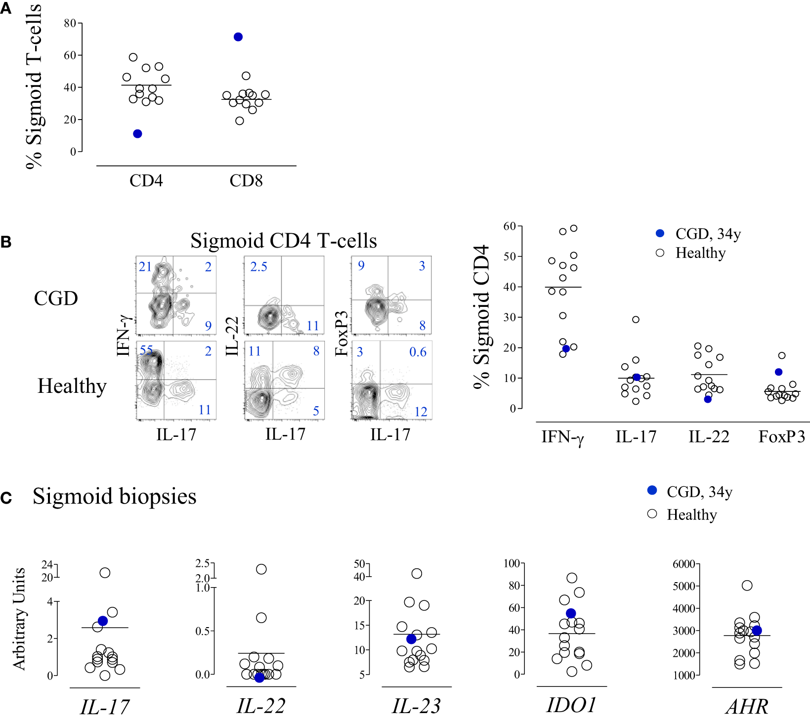 At 34 years of age, colonoscopy was performed due to an episode of prolonged diarrhea, with watery stool four to five times a day without mucus or blood, with no apparent microbial cause, accompanied by hypoalbuminemia without other evidence of exudative enteropathy or significant malabsorption. The gastrointestinal symptoms subsided spontaneously after 4 weeks. The mucosa was macroscopically normal with an overall preserved structure, with areas of mild inflammatory infiltrates with lymphoid aggregates in the gut biopsies. Cell suspensions from sigmoid biopsies were analyzed by flow cytometry, and patient data were compared with those of healthy subjects submitted to routine colon cancer screening colonoscopy. The CGD patient featured a decreased frequency of CD4+ cells within total T-lymphocytes in the sigmoid mucosa (Figure 4A) and a very low CD4/CD8 ratio (0.14), although we were unable to quantify the absolute counts in the histological material to confirm the CD4 loss. Importantly, in contrast to the circulating CD4 subset, the relative proportions of cells producing IL-17, IL-22, or IFN-γ, as well as FoxP3-expressing Treg, within sigmoid CD4 cells were within the range of healthy subjects (Figure 4B). Moreover, there were no alterations in the levels of expression of genes implicated in the regulation of these populations, namely, IL-17, IL-22, IL-23, IDO1, and AHR, in the sigmoid biopsies (Figure 4C). To the best of our knowledge, this is the first report of T-cell imbalances illustrating the occurrence of CD4 depletion at the gut mucosa in CGD. The apparent lack of Th17 expansion at the mucosal level warrants further investigation, given the known role of IL-17 in inflammatory bowel disorders (21, 22) and the importance of gut pathology in CGD patients.