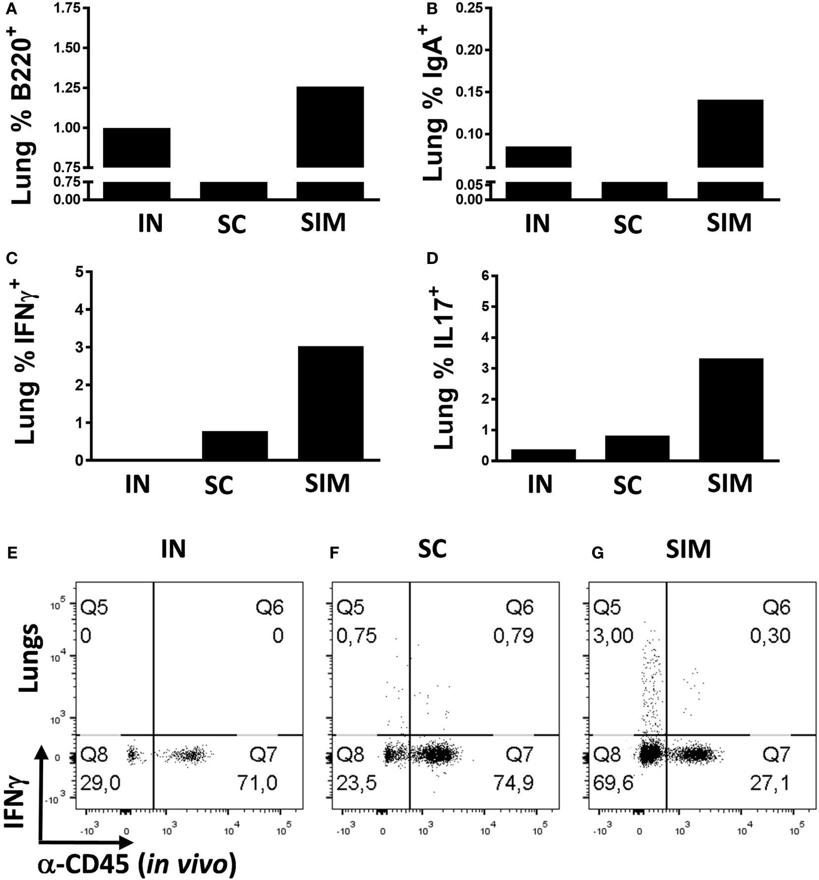 T and B cell frequencies in lungs following immunization. Mice were immunized twice with a mix of Hirep1, CTH93, and CAF01 with 2-week intervals using either the intranasal (IN), subcutaneous (SC), or simultaneous (SIM) immunization strategy. Two weeks after the last immunization, B cell- and T cell-mediated immune responses were depicted. (A,B) Frequencies of anti-CD45.2−(in vivo) anti-B220+, and anti-IgA+ B cells were assessed by flow cytometry (FACS) on pools of lung cells (n = 8). Pools of lung cells (n = 8) were restimulated in vitro with a mixture of Hirep1 and CTH93 and frequencies of interferon gamma (IFNγ) and interleukin-17-producing antigen (Ag)-specific T cells (CD4+CD44high and anti-CD45.2−(in vivo)) were assessed by intracellular flowcytometry (C,D) or frequencies of IFNγ-producing Ag-specific T cells (CD4+CD44high) are depicted as FACS plot (E–G).
