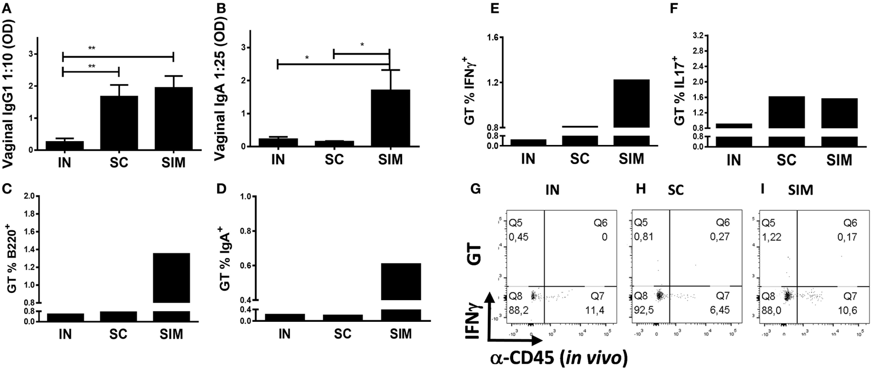 Antibody responses and B and T cell frequencies in genital tract (GT) following immunization. Mice were immunized twice with a mix of Hirep1, CTH93, and CAF01 with 2-week intervals using either the intranasal (IN), subcutaneous (SC), or simultaneous (SIM) immunization strategy. Two weeks after last immunization, (A,B) Hirep1- and CTH93-specific IgG1 and IgA titers were determined in vaginal swabs by enzyme-linked immunosorbent assay (n = 8). A 10-fold vaginal swab dilution is depicted for IgG1 and 25-fold dilution for IgA. Dilutions represent the linear phase of the titration curves for all immunization groups. Graphs show mean ± SEM, and statistical analyses are done by Kruskal–Wallis (non-parametric)/Dunn’s test. *p < 0.05, **p < 0.01. (C,D) Frequencies of anti-CD45.2− (in vivo) B220+ and IgA+ B cells were assessed by flow cytometry (FACS) on pools of GT cells (n = 8). (E–I) Pools of GT cells (n = 8) were restimulated in vitro with a mixture of Hirep1 and CTH93 and frequencies of interferon gamma (IFNγ) and IL-17 producing antigen (Ag)-specific T cells (CD4+CD44high and anti-CD45.2− (in vivo)) were assessed by intracellular flow cytometry (E,F) or frequencies of IFNγ producing Ag-specific T cells (CD4+CD44high) are depicted as FACS plot (G–I).