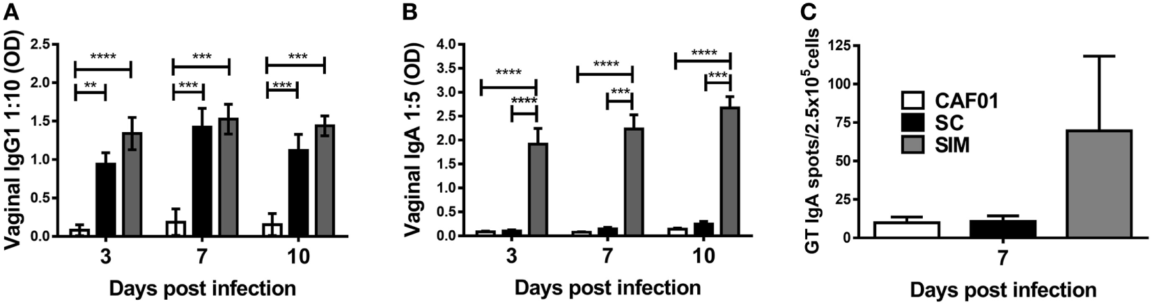 We further evaluated the humoral and cellular responses upon Chlamydia infection. SIM- and SC-immunized mice were infected intravaginally with C.t. 5 weeks after the last vaccination, and a CAF01 control group free of Chlamydia Ag was included. The vaginal Ab responses was evaluated on days 3, 7, and 10 p.i. (Figures 4A,B). There was no significant difference in the IgG1 titers in the SIM- and SC-immunized groups at any time points. In contrast, IgA remained undetectable day 10 p.i. in the SC group, whereas high IgA responses were present already by day 3 p.i. in the SIM group. To further evaluate localization of Ag-specific IgA+ cells, IgA ELISPOT was performed day 7 p.i. on lymphocytes extracted from the GT. As seen in Figure 4C, the result revealed higher numbers of Ag-specific IgA-secreting B cells in the GT of SIM-vaccinated mice compared to the SC group, correlating with the IgA titers. Thus, SIM immunization gave rise to an early IgA response in the GT upon Chlamydia challenge in contrast to SC immunization.