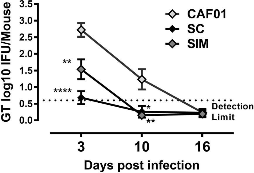 By day 3 p.i., the bacterial load was significantly reduced in the SIM and SC groups compared to the CAF01 immunized control group. The bacterial load was slightly lower, although not significantly in the SC group (Figure 6). By day 10 p.i., the bacterial load was below detection level in both of the vaccinated groups and, thus, significantly reduced compared to the control group, and by day 16 p.i. the IFU shedding was undetectable in the control group as well, suggesting a cleared infection.