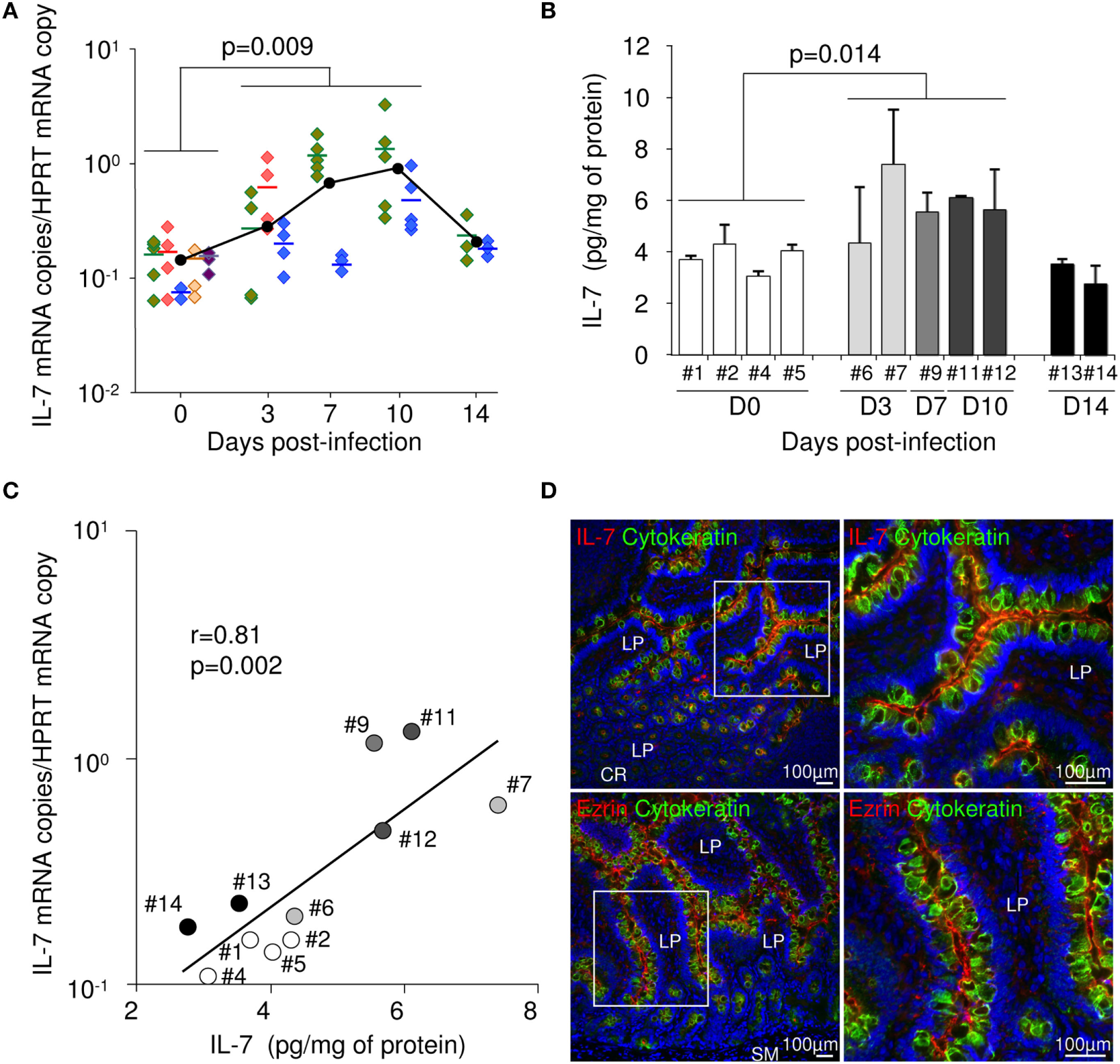 Intestinal tissue and LNs were sampled from five healthy and nine SIV-infected Chinese rhesus macaques sacrificed at days 3 (n = 3), 7 (n = 2), 10 (n = 2), or 14 (n = 2) following intravenous infection with 50 AID50 of SIVmac251. In these tissues, we first evaluated IL-7 expression by measuring mRNA levels using a highly sensitive qRT-PCR assay. Interestingly, IL-7 transcription significantly rose by day 3 in the ileum. Maximal IL-7 transcription was observed at day 7–10 post-infection (pi) (p = 0.009; Figure 1A). IL-7 expression returned close to baseline values at day 14. IL-7 mRNA levels were also increased by day 3 in the duodenum and the jejunum, slightly increased at day 10 in the large bowel and remained stable in the LNs, suggesting that the increase in IL-7 transcription was mostly confined to the small bowel in acutely SIV-infected macaques (data not shown). Quantification of IL-7 protein in the ileal tissue also demonstrated that IL-7 expression was higher in macaques sampled throughout acute infection than in uninfected monkeys. Mean local IL-7 concentration was 5.8 pg/mg of total protein from days 3 to 10, as compared to 3.7 pg/mg in uninfected controls (p = 0.014; Figure 1B). Moreover, in the ileum, IL-7 mRNA levels directly correlated with IL-7 protein concentration (r = 0.81; p = 0.002; Figure 1C), suggesting that increased transcription translated in increased protein production. Immunohistochemical staining confirmed epithelial cells as a possible source of intestinal IL-7. Indeed, similar to ezrin staining, IL-7 staining mostly localized at the apical pole of the epithelial cells as demonstrated by cytokeratin staining (Figure 1D).