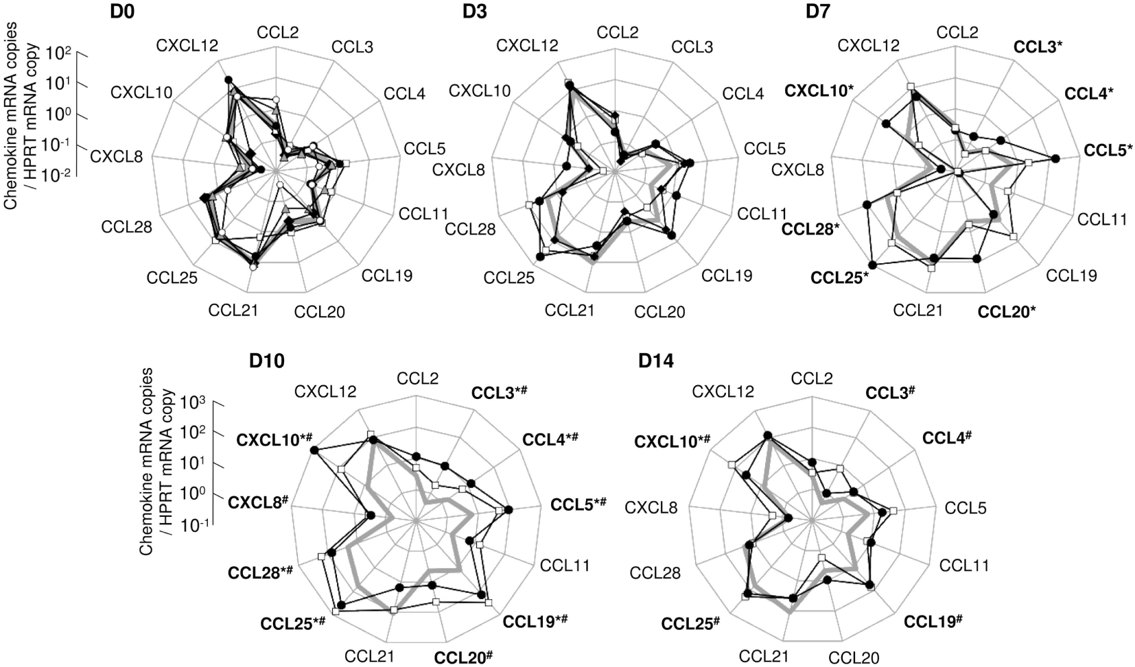 Assessment of the chemokine expression network in the ileal mucosa of simian immunodeficiency virus-infected macaques. Thirteen chemokines were quantified by RT-qPCR in ileal tissues sampled at day 0 (D0; macaques #1 open squares, #2 close diamonds, #3 close circles, #4 gray triangles, and #5 open circles), day 3 (D3; #6 open squares, #7 close circles, and #8 close diamonds), day 7 (D7; #9 close circles and #10 open squares), day 10 (D10; #11 close circles and #12 open squares), or day 14 (D14; #13 close circles and #14 open squares) pi (chemokine mRNA copies/HPRT mRNA copy). The bold gray line on days 3, 7, 10, and 14 graphs represents the median of chemokine concentrations of the five healthy macaques (D0). For each macaque, each dot represents the median of three to five independent samples, quantified in triplicate. Statistical analysis was performed individually for each infected macaque, compared to each healthy control. A given chemokine was considered as overexpressed in one infected macaque if significantly different from all healthy controls, tested independently (*p < 0.05 for macaque #9, #11, or #13, as compared to each uninfected monkeys; #p < 0.05 for macaque #10, #12, or #14, as compared to each uninfected monkeys; Mann–Whitney two-tailed U test).