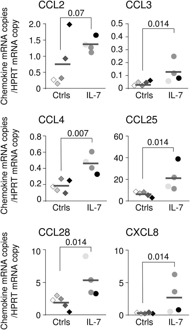 Chemokine expression in the intestinal tract of interleukin (IL)-7-treated rhesus macaques. CCL2, CCL3, CCL4, CCL25, CCL28, and CXCL8 mRNA expression in ileal tissues (three to five samples per macaque) sampled from five control rhesus macaques (macaques #1–#5; diamonds) and four healthy animals sacrificed 12 h (light gray circles), 1 day (dark gray circles), or 7 days (black circles) after systemic IL-7 treatment (80 μg/kg of body weight). Medians are shown as horizontal bars. Statistically significant differences between IL-7-treated and untreated monkeys were calculated using Mann–Whitney one-tail U test.