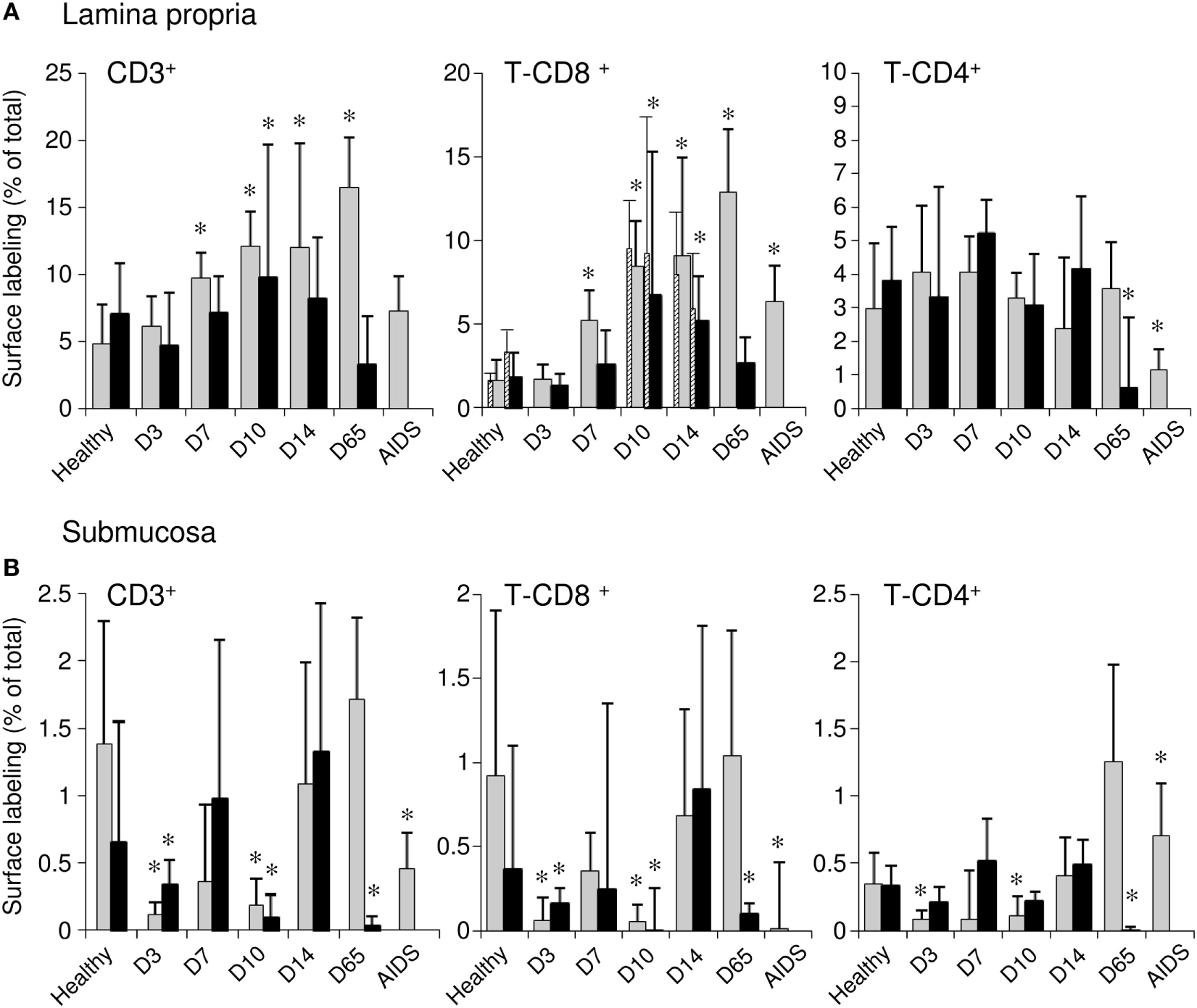 Changes in the CD4+ and CD8+ T-cell compartments in the ileum during simian immunodeficiency virus infection. Ileal tissues sampled from healthy animals as well as from macaques euthanized at 3, 7, 10, 14, or 65 days post-SIV infection (two animals per time point), and from one animal presenting with AIDS-related symptoms, were labeled using anti-CD3 and anti-CD4 antibodies. The proportions of lamina propria [LP; (A)] or submucosa [SM; (B)] tissues occupied by the CD3+, CD3+CD4− (T-CD8+), and CD3+CD4+ (T-CD4+) labeled cells are represented as medians and SDs for each time point. For each animal, 5–10 independent areas, representing at least 1.5 mm2 of LP or 1.4 mm2 of SM, were quantified. Hatched bars on the T-CD8+ graph [(A), central panel] represent quantifications of CD3+CD8+ cells (labeled with anti-CD3 and anti-CD8 antibodies) performed on tissues sampled on days 0, 10, or 14 pi. Statistical analysis was performed for each infected macaque, compared individually to each healthy control. A given subset was considered as over/under represented in one infected macaque if significantly different from both healthy controls, tested independently (*p < 0.05 as compared to each uninfected monkeys; Mann–Whitney two-tailed U test).