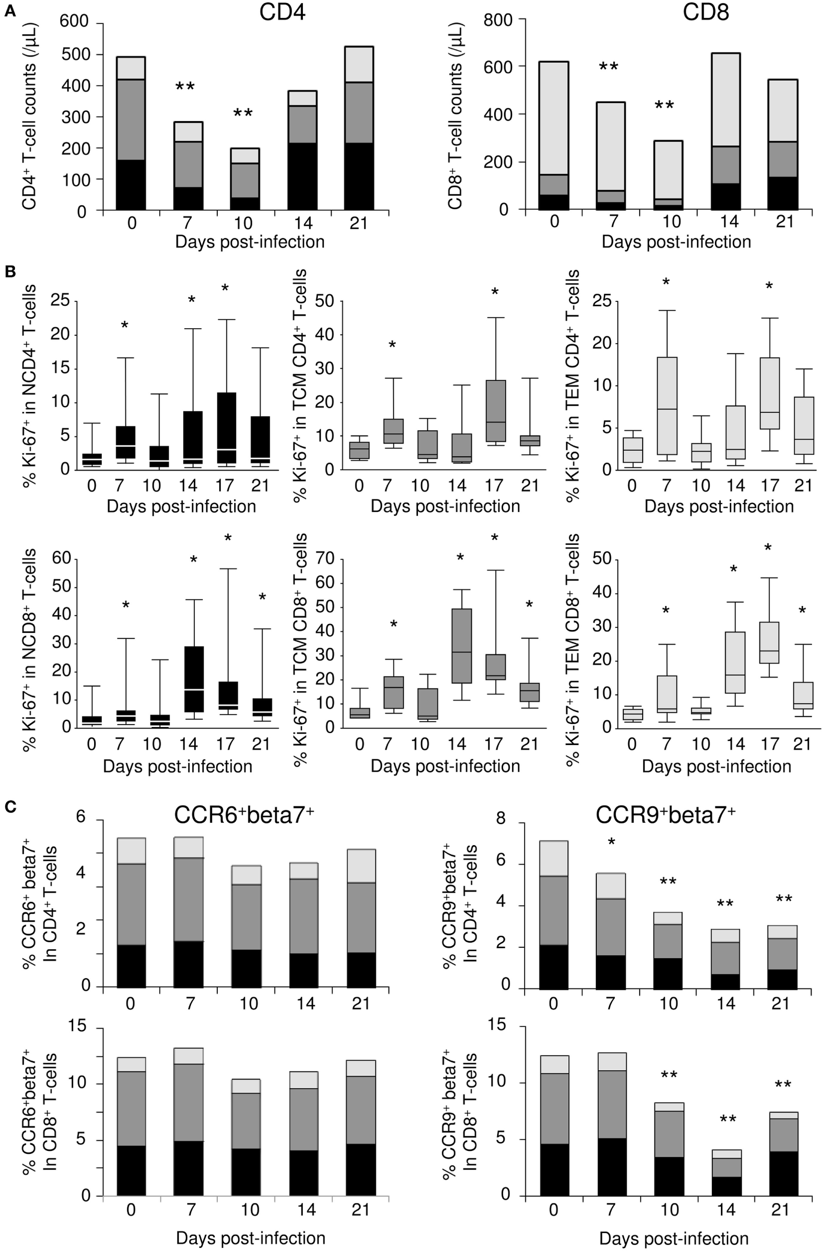 Altogether, these data suggest that chemokine expression in organs, and in particular in the small intestine, triggers massive recruitment of circulating T-cells from peripheral blood. By day 14, cells migrating back into the circulation express the Ki-67 proliferation marker, suggesting that these cells have undergone either antigen priming or cytokine (IL-7) stimulation, especially within the small intestine.