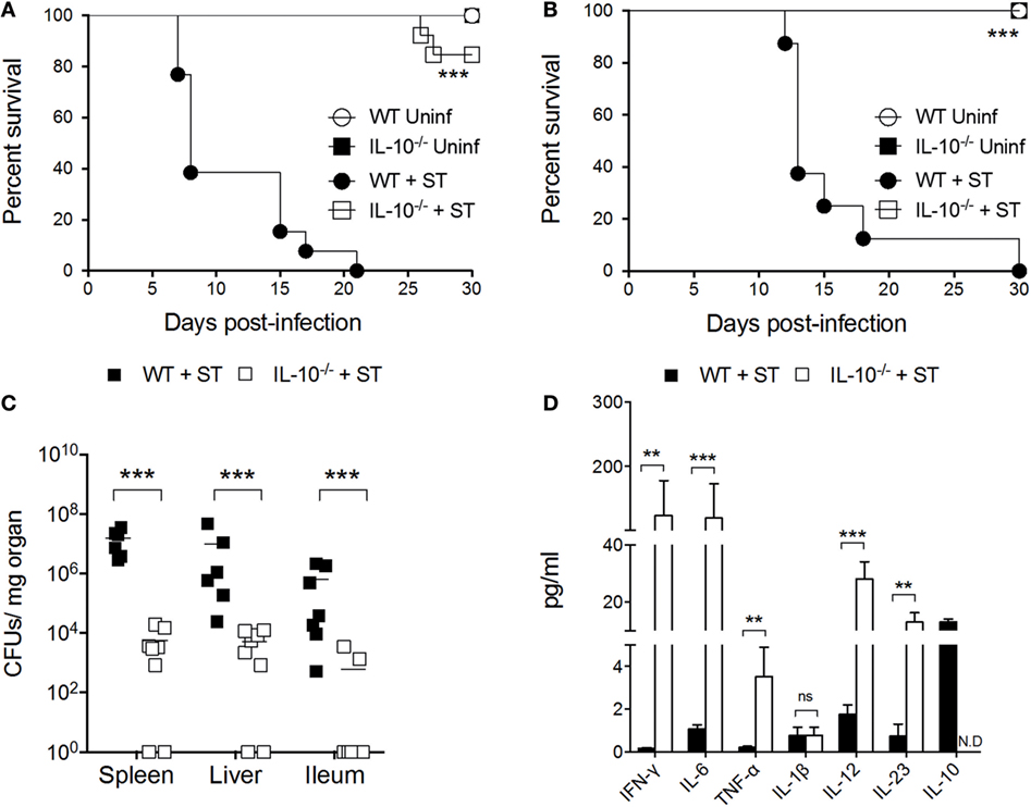 Figure 1. Absence of interleukin-10 (IL-10) production improves host survival and prevents systemic dissemination of S. Typhimurium. Wild-type (WT) C57BL/6 and IL-10−/− mice were infected (A) orally and (B) intraperitoneally with S. Typhimurium (ST) and survival rate were followed for 30 days. (C) Bacterial burden in spleen, liver, and ileum and (D) cytokine production in serum were evaluated in orally infected WT and IL-10−/− mice at 5 days post infection. For survival assays, ***P < 0.001 log-rank test. For colony forming units (CFUs) loads and cytokine quantification, a student’s t-test was performed between WT- and ST-infected mice; **P < 0.01; ***P < 0.001.