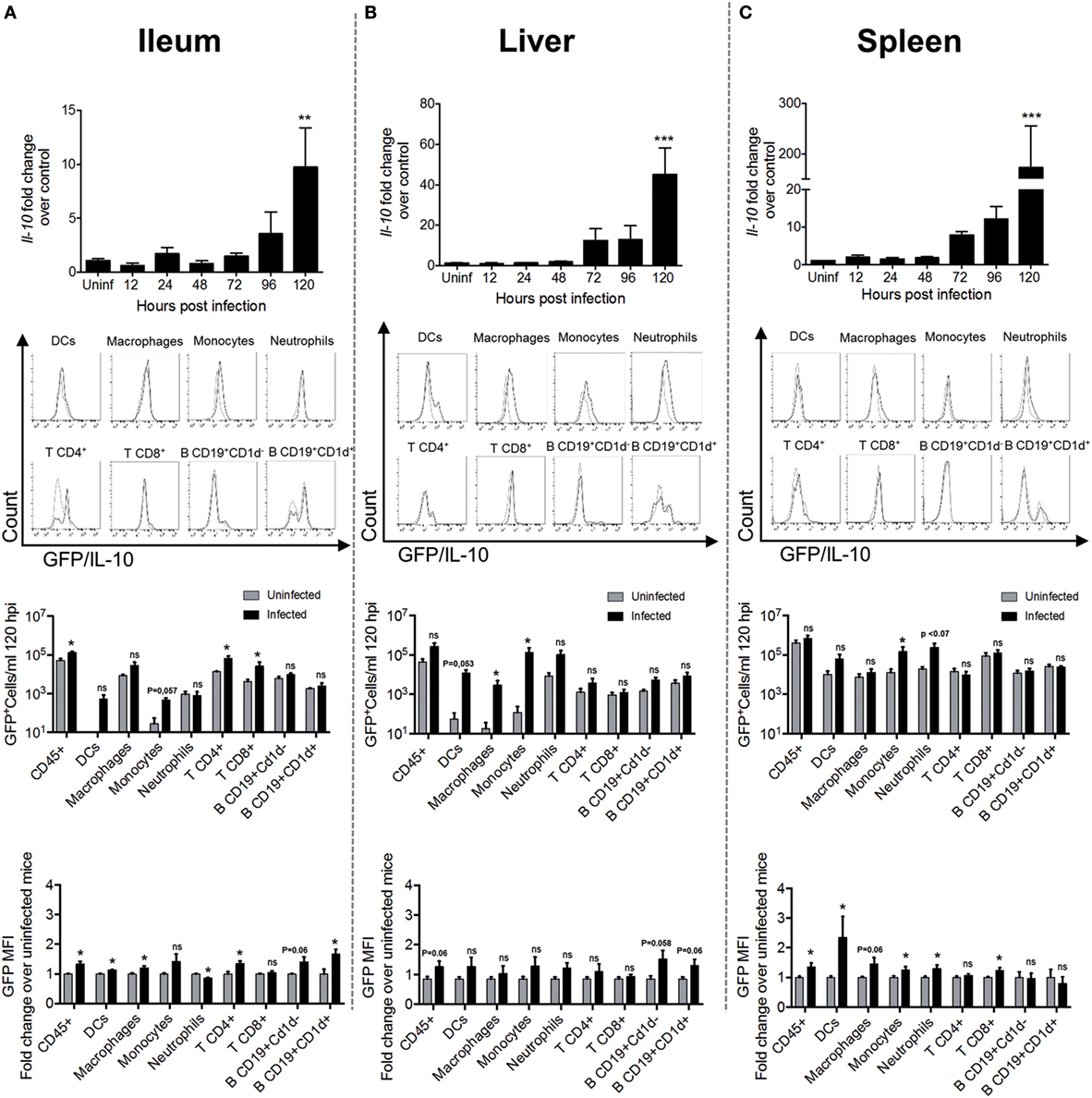 Figure 2. Interleukin-10 (IL-10) production significantly increases in target tissues after 120 h of S. Typhimurium infection. In the panels of the upper row, Il-10 messenger RNA (mRNA) production was quantified by RT-PCR in ileum (A), liver (B), and spleen (C) of infected WT mice at different time post-infection. The panels of the second row show representative flow cytometry histograms obtained to identify the cell source of IL-10 production at 120 h post infection in ileum (A), liver (B), and spleen (C) of IL-10/GFP VertX that were orally infected by S. Typhimurium. In the third-row panels, a quantification of IL-10 producing total leukocytes, dendritic cells (DCs), macrophage, monocytes, neutrophils, CD4+ T cells, CD8+ T cells, CD19+CD1d− B cells, and CD19+CD1d+ B cells in ileum (A), liver (B), and spleen (C) were identified by flow cytometry. The quantification of IL-10/GFP+ cells was performed using count bright beads. The last row panels show the fold change of the medium fluorescence intensity of GFP/IL-10 in myeloid and lymphoid cell types during S. Typhimurium infection at 120 h post infection. For Il-10 mRNA production, **P < 0.01; ***P < 0.001 (one-way analysis of variance test with a posteriori multiple comparison test).