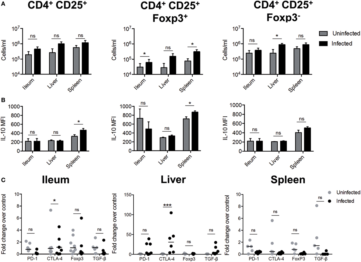 Figure 3. S. Typhimurium infection induces the generation of regulatory T cells (Tregs cells). C57BL/6 mice were left uninfected or orally infected with 1 × 105 CFU of S. Typhimurium and after 96 h post infection of infection the ileum, liver, and spleen was recovered to detect the presence of Tregs. (A) Quantification of total CD4+CD25+; CD4+CD25+FoxP3+, and CD4+CD25+FoxP3− T cells. (B) Measurement of mean fluorescence intensity (MFI) of IL-10 secretion by flow cytometry in target tissues ex vivo. Gray bars = uninfected; black bars = infected. *P < 0.05, ***P < 0.001 (Student’s t-test). (C) Tregs cells markers expression in target tissues during S. Typhimurium infection. The quantification of messenger RNA (mRNA)-encoding Tregs cells markers were evaluated in target tissues infected by S. Typhimurium, using quantitative real-time RT-PCR at 5 days post infection with specific TAQMAN probes. β2-microglobulin gene was used as endogenous control. The results are shown as fold change of relative expression, compared with wild-type (WT) uninfected mice (ΔΔCT). Statistical analysis was performed using two-way ANOVA with Bonferroni post test (*P < 0.05; **P < 0.01; ***P < 0.0001).