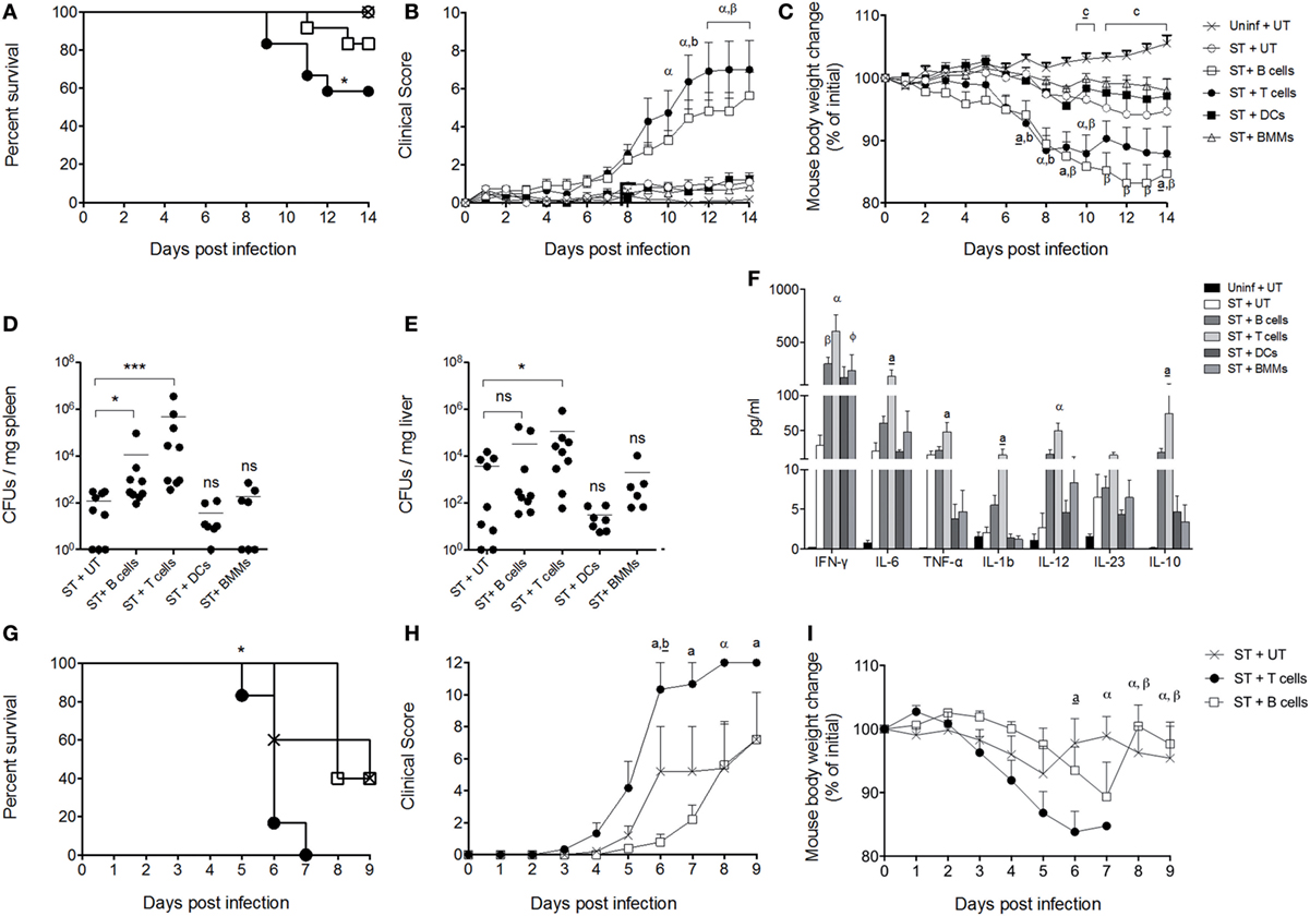 Figure 4. Interleukin-10 (IL-10) production by T cells enhances the severity of the infection caused by S. Typhimurium in mice. Dendritic cells (DCs), BM macrophages, B cells, and T cells isolated from wild-type (WT) mice (1 × 106 cells) were adoptive transferred to IL-10−/− recipient mice. Twenty-four hours after cell transfer, recipient mice were orally infected with 1 × 105 CFU of S. Typhimurium. Then survival rate (A), clinical score (B), and weight loss (C) of DCs (ST + DCs), BMM (ST + BMMs), B cells (ST + B cells), and T cells (ST + T cells) recipient mice were followed over 14 days. As controls, uninfected/untransferred (Uninf + UT) and infected/untransferred (ST + UT) groups were added. After 5 days of infection, bacterial burden was evaluated in (D) spleen and (E) liver in eight randomly selected DCs, BMM, B cells, and T cell recipient mice. After 14 days of infection, serum of DCs, bone marrow-derived macrophages (BMM), B cells, and T cell recipient mice was obtained and cytokine production was evaluated by Luminex (F). B cells and T cells isolated from WT mice were adoptively transferred to Rag.1−/− mice. Twenty-four hours later, mice were orally infected with 1 × 105 CFU of S. Typhimurium, and survival (G), clinical score (H), and weight loss (I) were evaluated for 9 days. For CFUs and cytokine quantification in vivo *P < 0.05, ***P < 0.0001 by Kruskal–Wallis test compared with ST + UT mice (IL-10−/− mice infected untransferred). Statistical analysis of cytokine production is indicated by letters in the figure and was performed using two-way ANOVA with Bonferroni post-test. a: *P < 0.05; a: **P < 0.01; α,β: ***P < 0.0001; represents IL-10−/− mice infected and transferred with T (a, a, α) and B cells (b, β), respectively, compared with ST + UT mice. ɸ: *P < 0.05; IL-10−/− mice infected and transferred with BMMs compared with ST + UT mice. *P < 0.05 log-rank test was performed for survival curves; body weight changes and clinical score were analyzed using two-way ANOVA with Bonferroni post-test. IL-10−/− mice infected and transferred with T (a, a, α) and B cells (b, b, β) were compared with ST + UT mice, respectively. Statistical significance was indicated by letters. a,b: *P < 0.05; a,b: **P < 0.01; α,β: ***P < 0.0001. Comparison between Uninf + UT mice and ST + UT mice was represented as c: *P < 0.05; c: ***P < 0.0001.