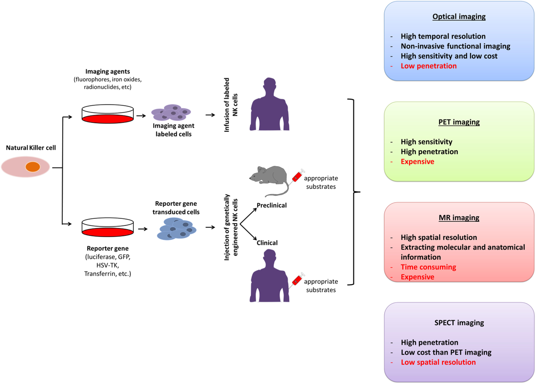 Molecular imaging strategies for non-invasive in vivo tracking of natural killer (NK) cells; their advantages and disadvantages. PET, positron-emission tomography; SPECT, single photon-emission computed tomography; MR, magnetic resonance; GFP, green fluorescence protein; HSV-TK, Herpes simplex virus-thymidine kinase.